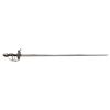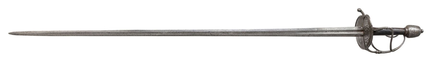 Overall length 44" with a 37" double edge blade with short 7" fuller with armorers mark. The hilt consist of asymmetrical heart shaped guard with pierced plates, and thumb loop. The knuckle bow, inner and outer branches have a central fluted swell attached and are attached to the engraved drum pommel. The grip is missing its wrap. CONDITION: Metal surfaces have been cleaned. The blade has a rounded tip with some old pitting present and a few light dings. Grips have a few age cracks, scattered dings and handling marks. PROVENANCE: Estate Collection of Nicholas Apergis. (02-24685/ZAL) $1500-2500