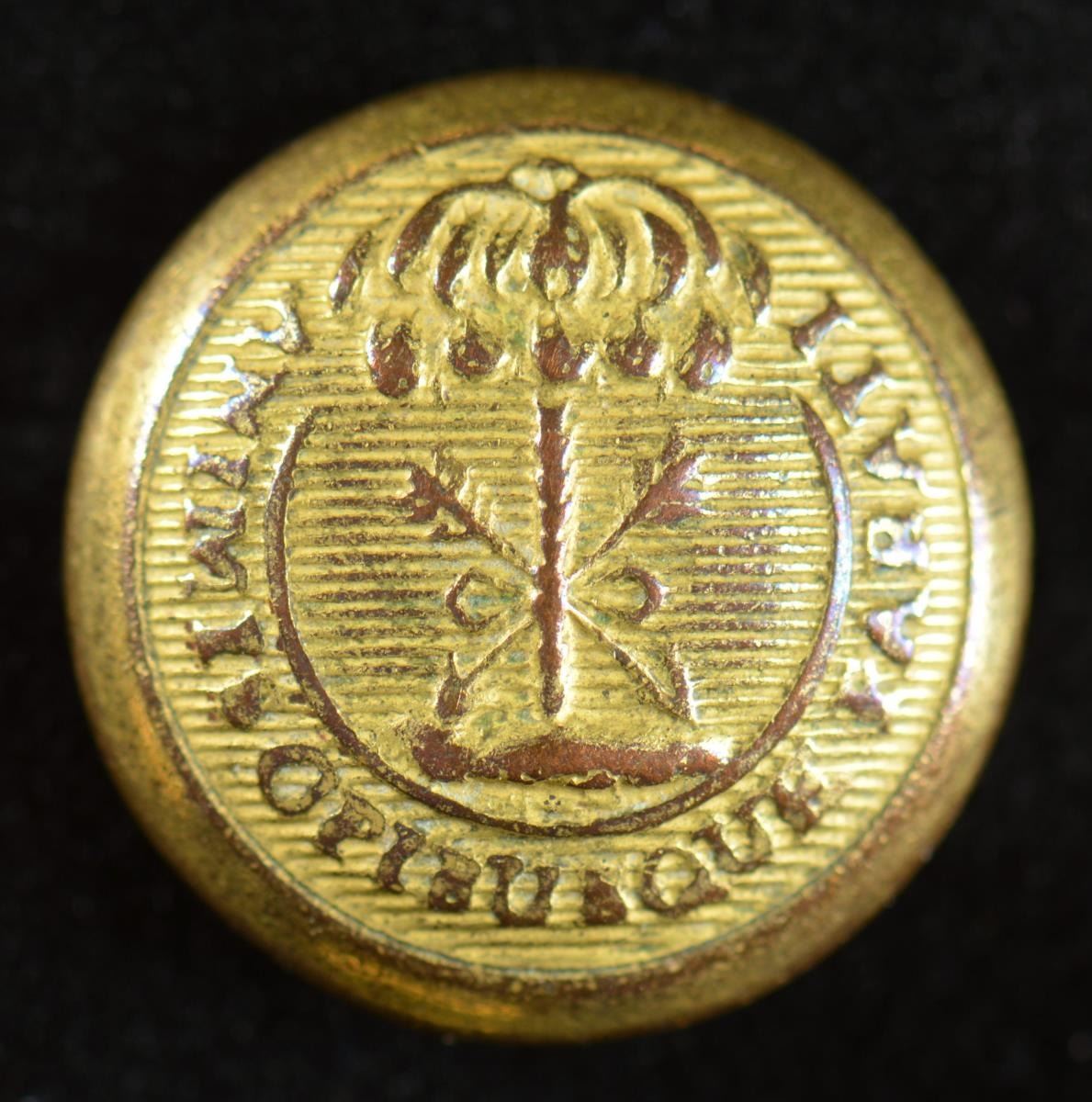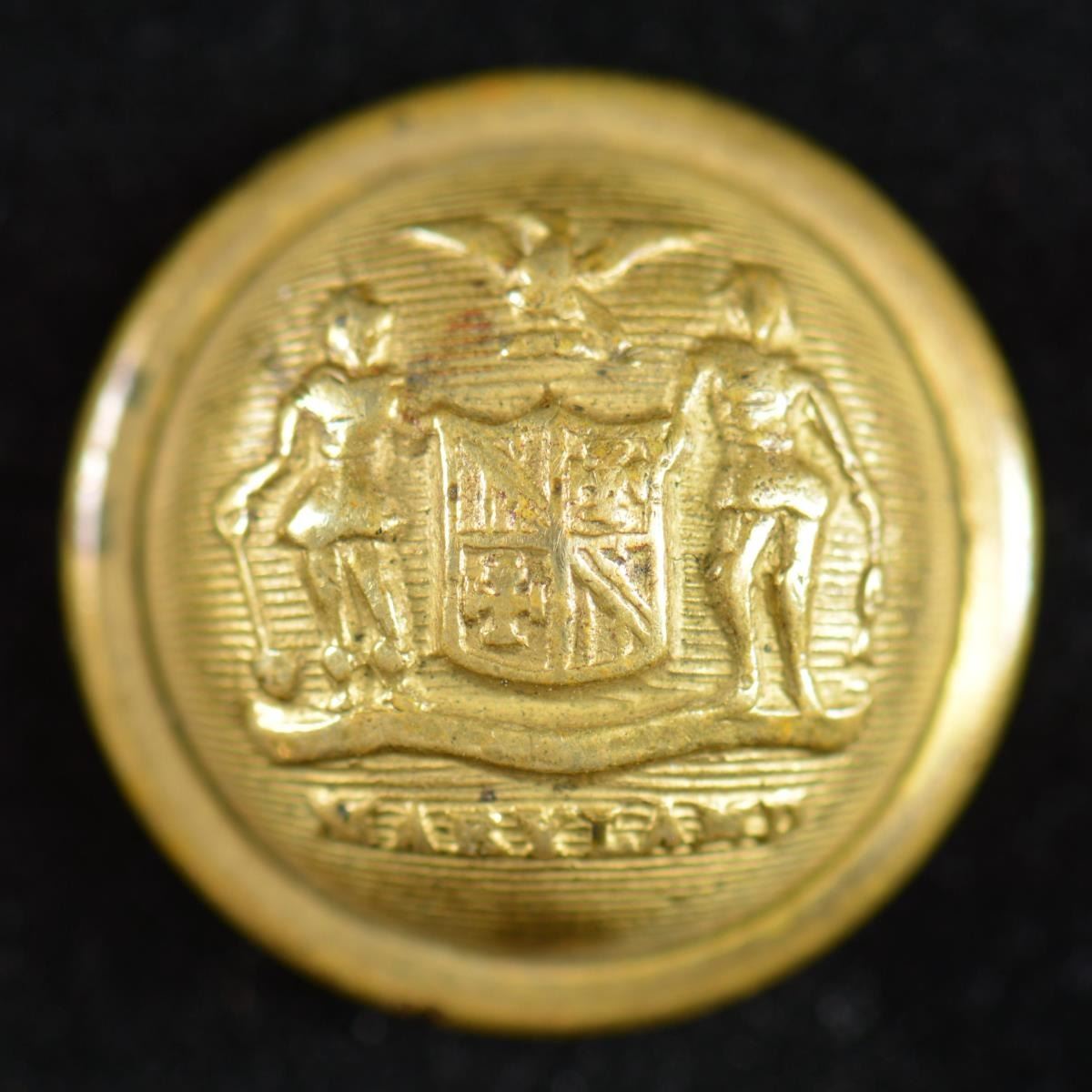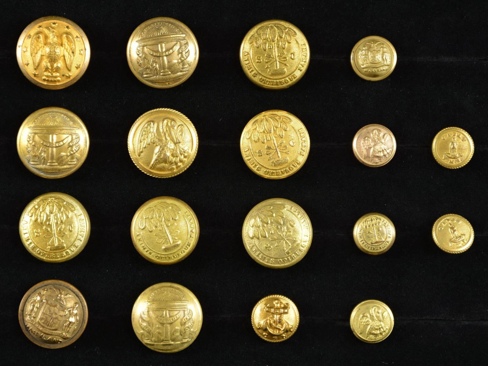 This group of non excavated buttons includes 1 CS-5-A3. / 1 GA-4-A1. / 2 GA-2-A. / 2 SC-16-A. / 2 SC-15-A. / 1 SC-11-A. / 1 SC-13-A cuff. / 1 LA-7-A2. / 1 LA-6-A2 cuff. / 1 LA-6-type cuff. / 1 SU-408-type cuff with an Evans back mark. / 1 CS-56-type cuff. / 1 MD-11-type. / 1 MD-11-type cuff. All buttons are coat sized, unless otherwise noted. CONDITION: all buttons are in non excavated condition and most have substantial gold finish remaining. All have nice straight shanks and no pushes. (02-18117-4/BF). $1,800-2,200.