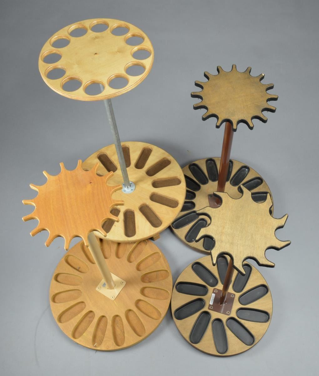 Capacity ranges from 12-16 guns. Wood is finished in light maple color to darker walnut color. 3 Made w/ holes instead of notches in the top plate. Racks measure approx. 23" in diameter at the floor up to 15" in diameter at the top. Although sizes may vary somewhat. Height ranges from approx. 33" - 38". CONDITION: all appear complete & serviceable. One has detached top. May have light wear & scuffing. (02-15392/RW). $200-300.