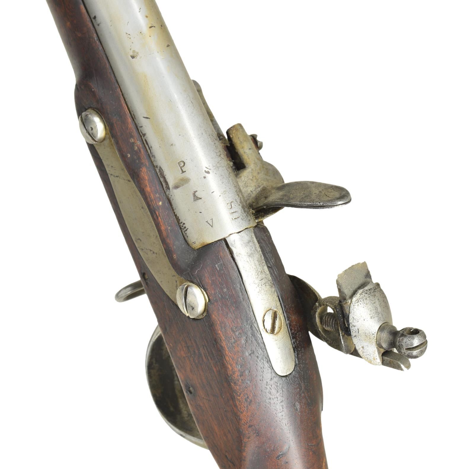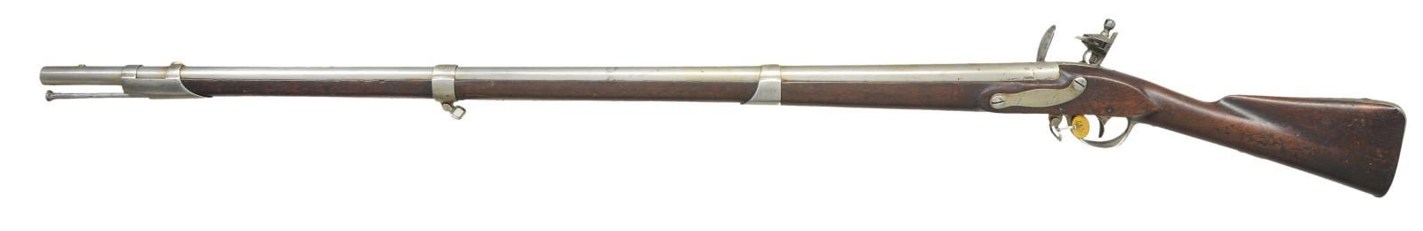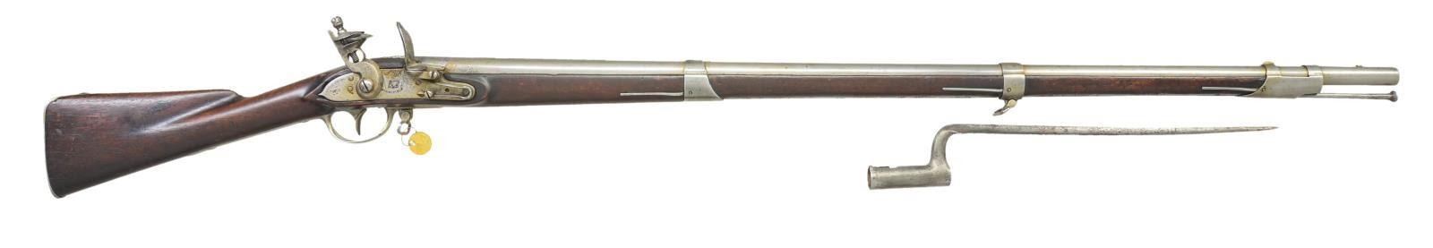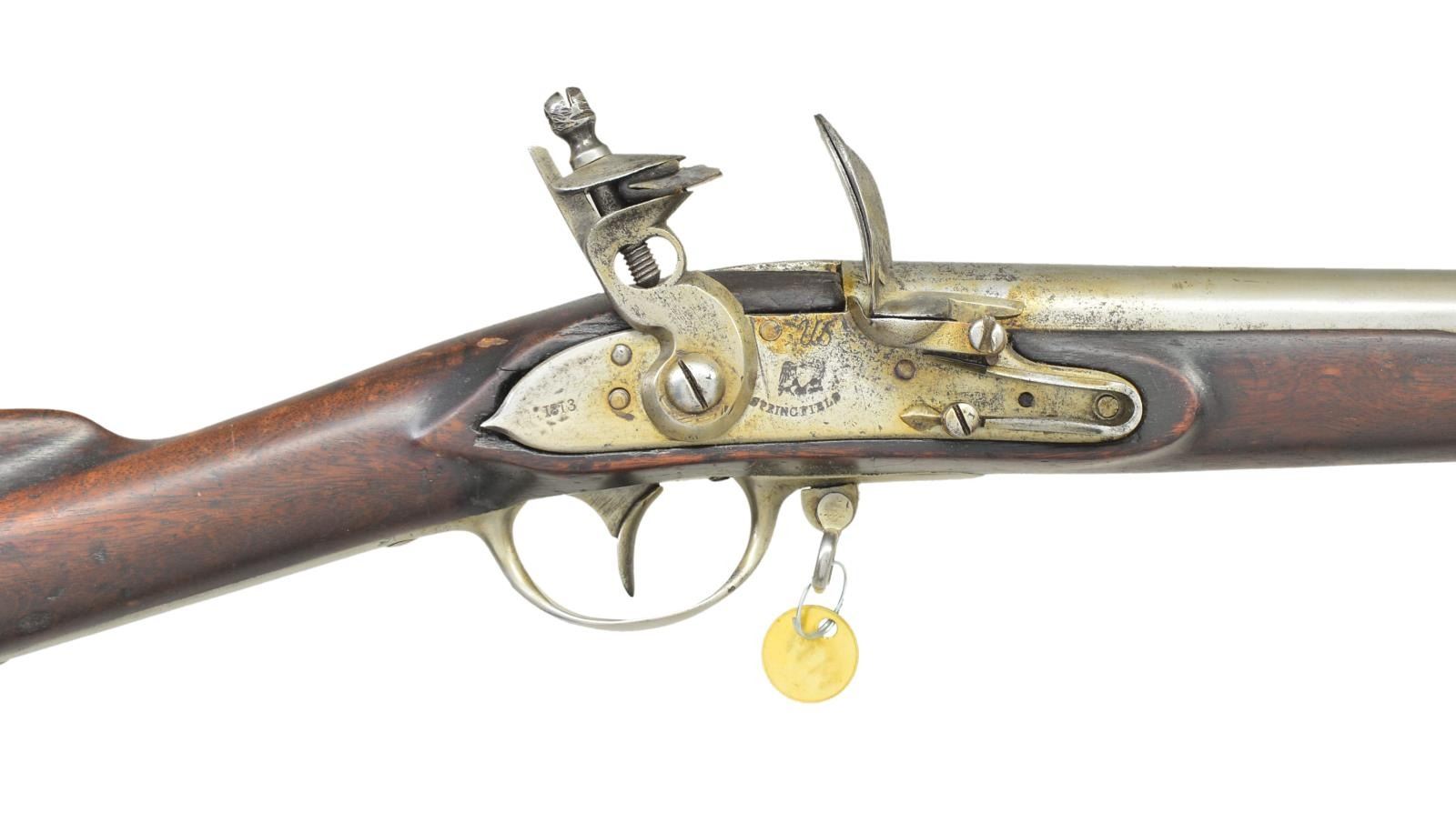 & BAYONET. Cal. 69. NSN. Standard configuration of post 1815 arsenal rebuilt to 1816 specifications from type III 1795 (made 1809-1814), 56.5” overall, 41.5” barrel stamped top of breech “US” & proofed on left “P / eaglehead / V”. Pointed tail lock dated 1813, script “US” over eagle & “SPRINGFIELD in arc. Original correct battery with flat cock with heart shaped cutout, integral round bottom pan, refaced faceted frizzen face with medial ridge & straight tail, frizzen spring terminates in triangular finial. High comb stock replaced with 1816 pattern low comb walnut stock. Same iron furniture utilized, 3 spring retained bands, buttplate dated “1813” on top. Bayonet has central fluted 15” blade stamped “US” lengthwise. CONDITION: good to very good overall, appears original flint, appears complete and original. Metal has cleaned mottled gray/bright iron patina, good markings, wallowed out vent. Stock is sound with hand worn patina, no inspection marks. Lock is functional but won’t hold at half cock, smooth dark bore. Bayonet fits musket too tightly with matching “G” proofs, pitted. (01-22764/JS). ANTIQUE. $2,000-3,000.
