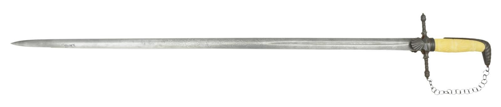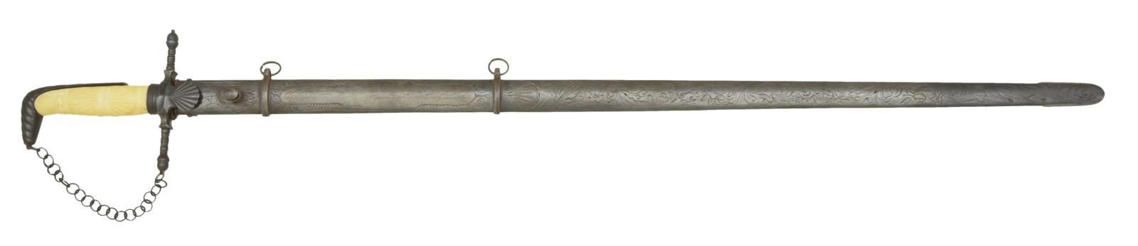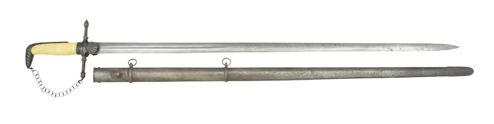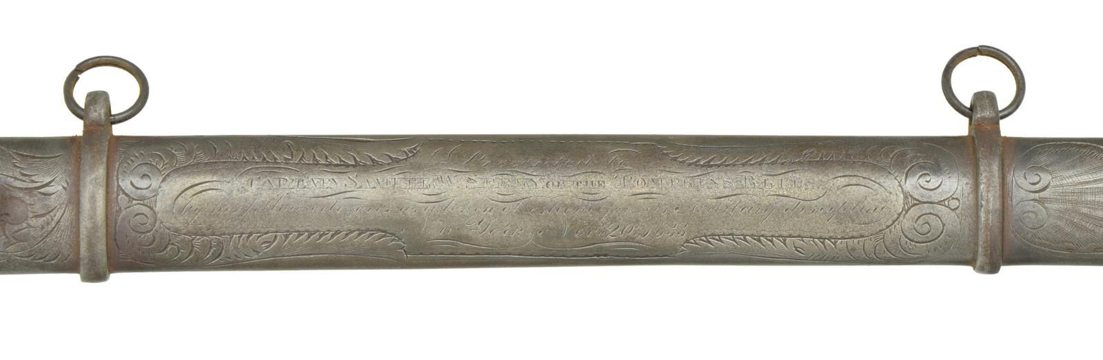 OF THE TOMPKINS BLUES OF BROOKLYN, NEW YORK. Overall length: 36 1/2". Blade length: 31". Blade has a single narrow central fuller & is etched over 2/3 of its length with various foliate, military & patriotic motifs including an eagle with "E PLURIBUS UNUM" banner, a field of 15 stars, federal shield & flag & Lady Liberty. Steel hilt with turned guard featuring acorn finials & scallop shell languets. Pistol grip pommel with incised diagonal lines. Decorated back strap with carved bone grip. Steel scabbard is engraved with a plethora of foliate motifs & a lg. panel that reads, "Presented to CAPTAIN SAMUEL W. SEELY OF THE TOMPKINS BLUES by his fellow citizens as a token of esteem for his Military discipline New York Nov..20th.. 1833". CONDITION: blade has a cleaned gray finish with easily viewed etching. Hilt has no oxidation but is a bit loose. There is sm. 1" section of backstrap missing above the ferrule. Scabbard has a dark finish but is free from oxidation. Engraving shows wear but is quite legible. (02-19516/BF). $1,200-1,800.