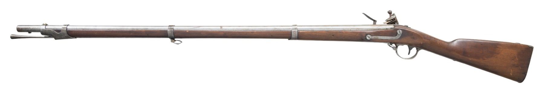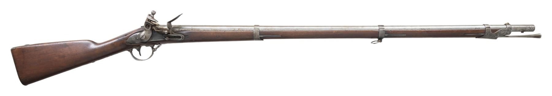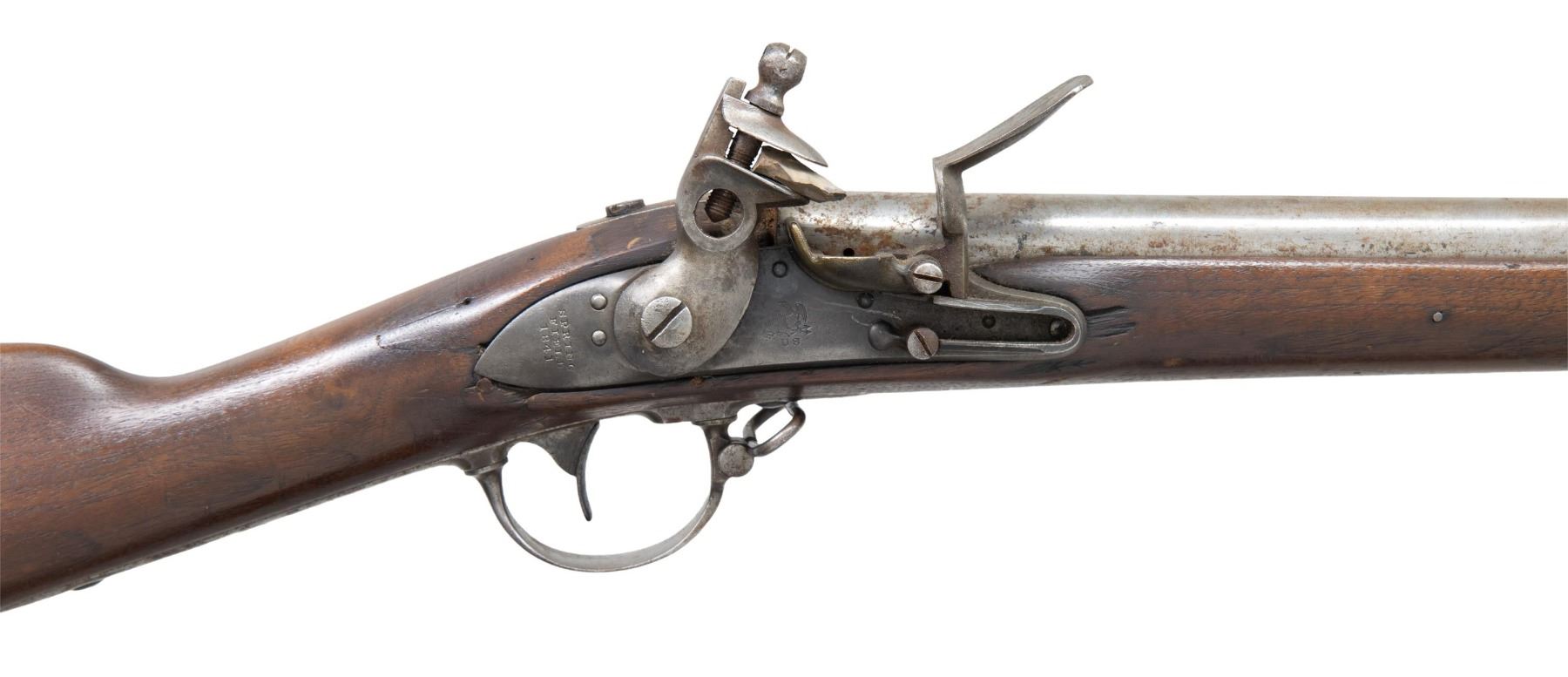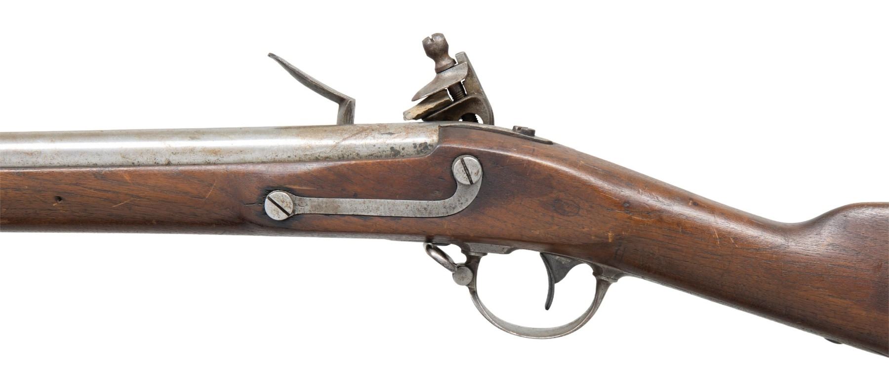 MUSKET. Cal. 69. NSN. 57.5" overall, 42" barrel with no visible proofs. Flat lock beveled at tail dated 1841 & "SPRING / FIELD" vertically stamped & forward of cock eagle over block "US". Battery with rounded convex cock with round cutout, detachable brass pan, frizzen spring terminates in wide teardrop shaped finial. Walnut stocked with 3 spring retained bands, inspection marks opposite lock rear of side plate. Most model 1840s were altered to percussion before leaving armory. CONDITION: good to very good overall, appears complete, iron cleaned, barrel bright, lock has crisp markings, stock has large inset repair rear of lock and missing piece where burned out, 2 small cartouches opposite lock. Original ramrod protrudes past muzzle face. Mechanically fine, smooth clear bore. (01-27835/JS). ANTIQUE. $1,200-1,800.