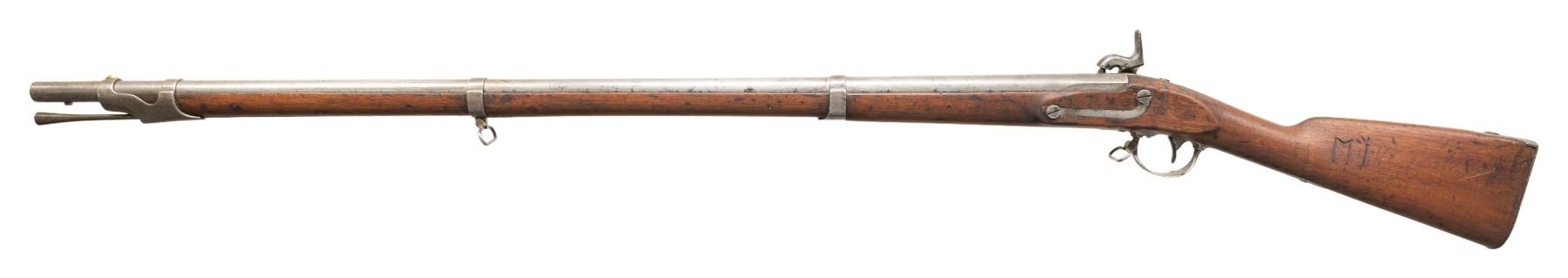 MUSKET. Cal. 69. NSN. Federal armory alteration of Springfield flintlock to percussion via "Belgium system" of plugging barrel vent and threading nipple directly into barrel. The original lock plate had percussion hammer fitted with removal of flintlock components. This is an honest complete example of one of over 300,000 conversions made prior to the Civil War of which many were issued to volunteers in 1861. 42" round barrel has VP Eaglehead proofs on left side of breech, "1842" on tang. Soldier initials cut in butt stock. Lock has small eagle above "US" forward of hammer and "SPRING / FIELD / 1841" stamped vertically at tail. CONDITION: very good overall, complete and matching sling swivels and ramrod, good markings, stock is sound and well fit, two discernible inspection cartouche. Mechanically fine with clear smooth bore. PROVENANCE: from the PMRB Collection. (01-28438/JS). ANTIQUE. $500-800.