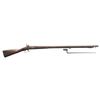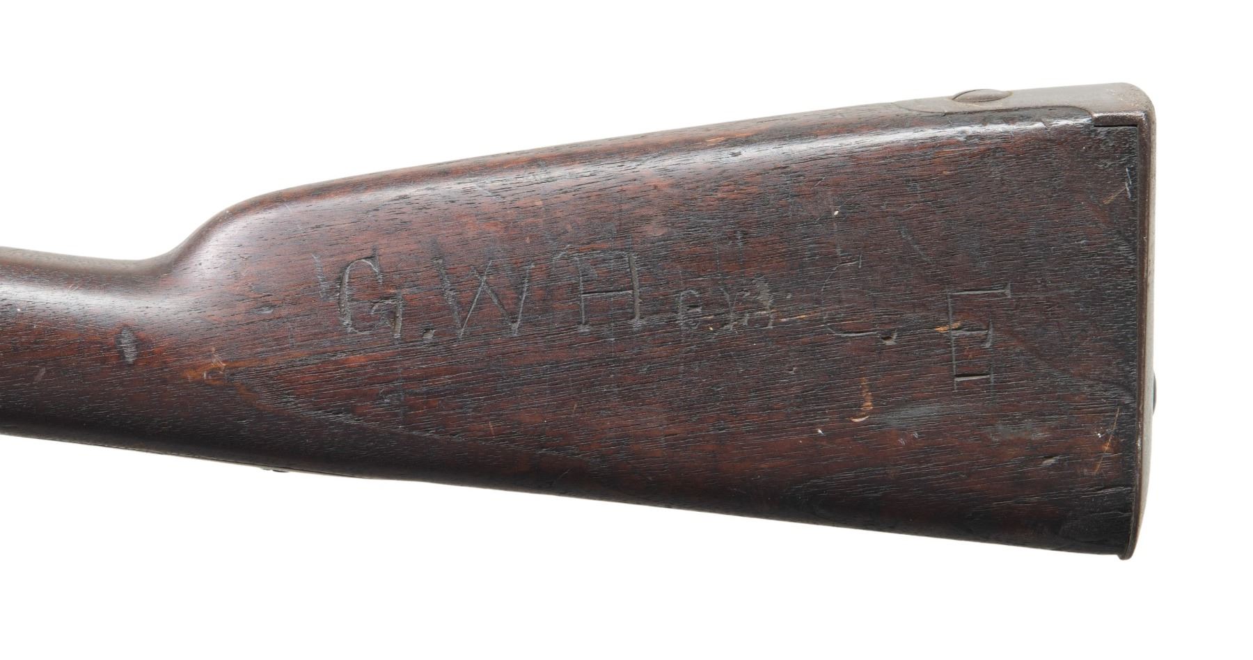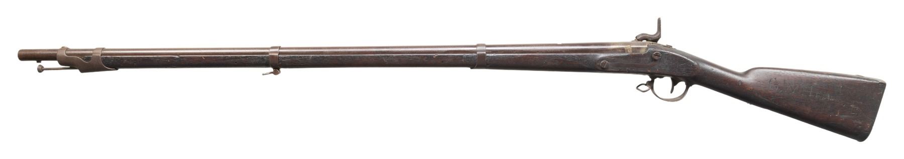SOLDIER'S NAME & BAYONET. Cal. 69. NSN. Standard configuration, 42" barrel dated 1854 with VP eaglehead proofs, missing rear sight as armory rifled, carved on left butt stock "G. W. Hor.. Co E". CONDITION: good overall, "as found" dark patina, lock markings discerned though eagle is weak, complete & matching other than replaced ramrod, US surcharged bayonet fits well. PROVENANCE: from the PMRB Collection. (01-28436/JS). ANTIQUE. $500-800.