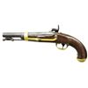 MARTIAL SINGLE SHOT PISTOL. Cal. .54. NSN. Standard configuration of one of the last US martial single shots made and a fine “as found” survivor. CONDITION: very good overall, all original and complete, good markings, barrel inspected and marked “STEEL” on left breech, 2 discernible inspector cartouches. (01-21475/JS). ANTIQUE. $800-1,200.