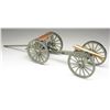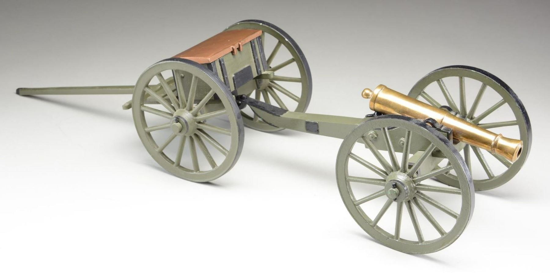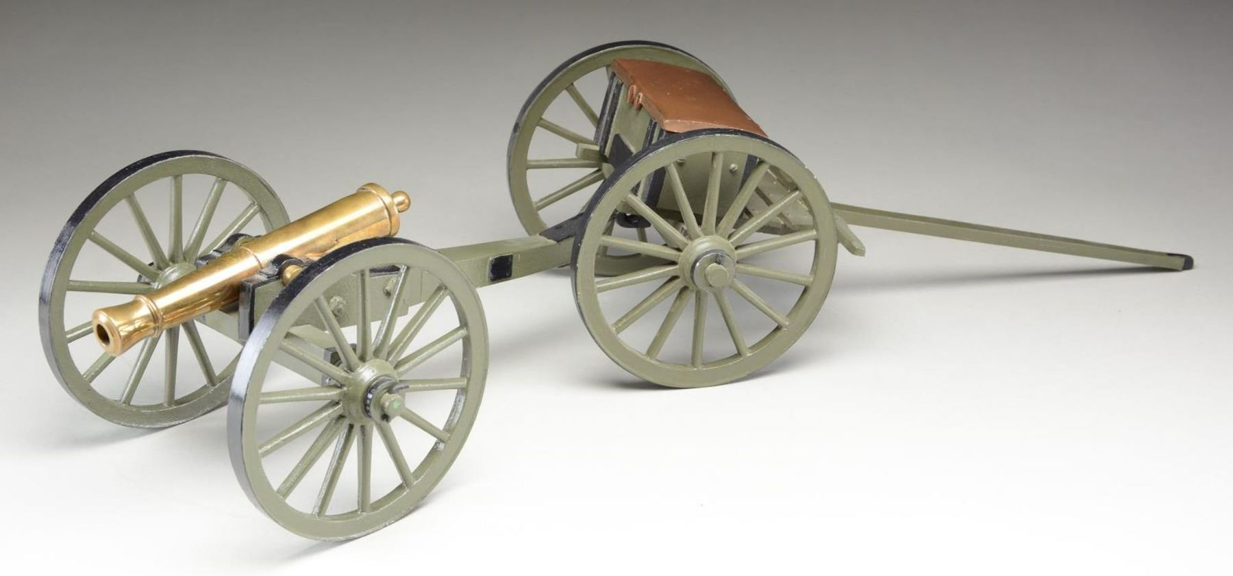 This lot consists of a model Napoleon Cannon w/ caisson. The model appears unmarked & has a brass bbl. The cannon measures about 16" in length from muzzle of bbl. to hitch. The diameter is 7 1/2" across wheels. The caisson measures 12 1/4" from rear to front of hitch. The width is 7 1/2" across wheels. CONDITION: brass parts are turning to a yellow patina w/ scattered oxidation & some dings The green paint shows some scattered light flaking. PROVENANCE: From the Lifelong Collection of Glen E. Mattox. (02-18565/MJC). $400-600.