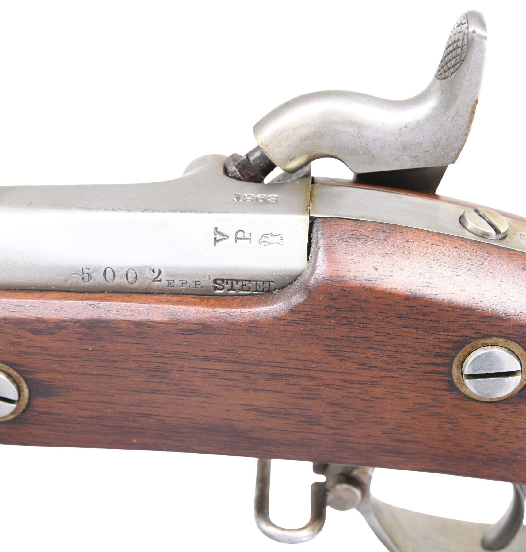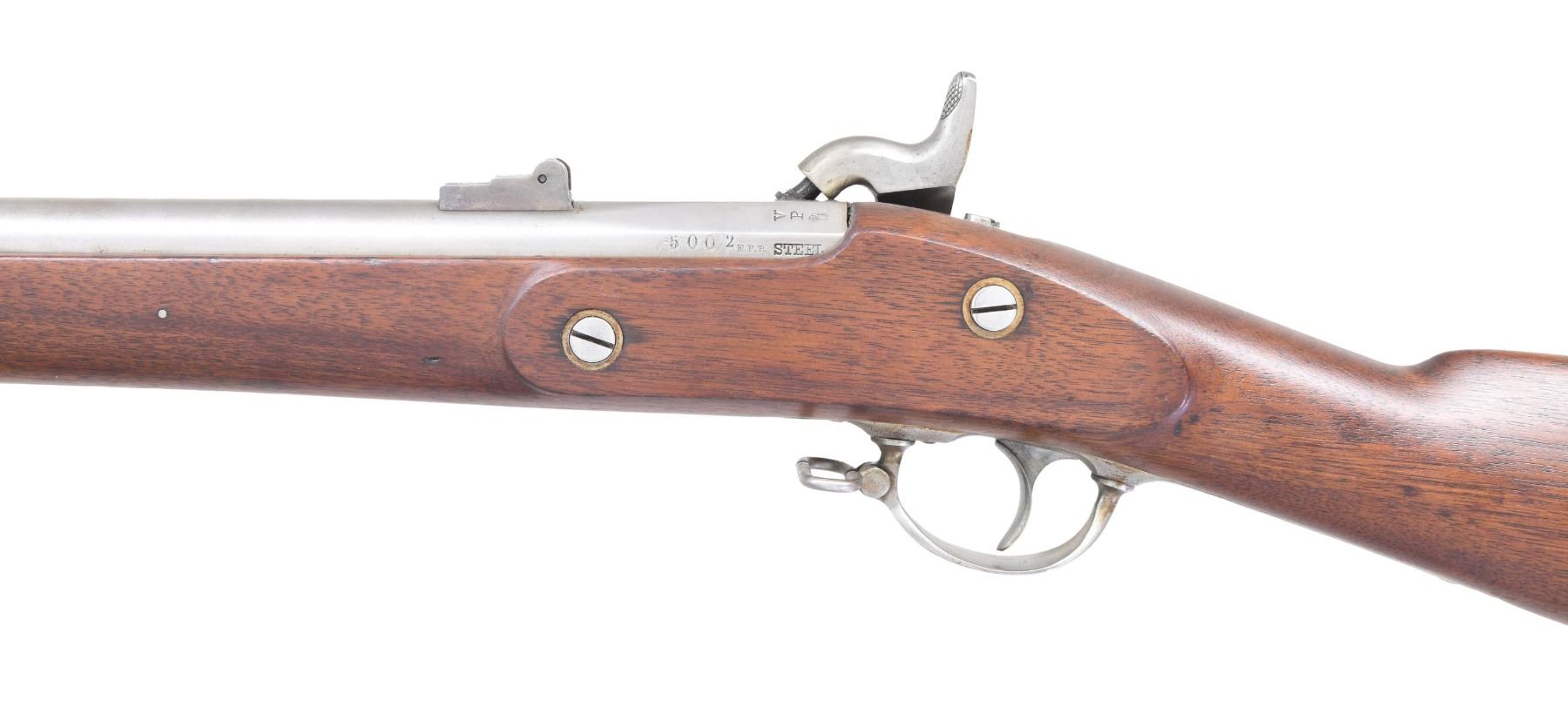 MUSKET. Cal 58. NSN. Standard configuration, steel clamping bands, iron furniture, 40" barrel marked at breech: "5002", "E.P.R", "STEEL", "VP" over eaglehead, "1863", three position-2 leaf blued rear sight. Lock is bright with light two-line Colt address below "U.S.", "1863" at tail. No inspection cartouches. "US" surcharge on top of buttplate. CONDITION: fine overall, smooth polished metal overall, crisp markings other than weak lock stamps, stock is sound and sharp edges, refinished. Mechanically fine, crisp rifled bore with some pitting. (01-27121/JS). ANTIQUE. $1,500-2,500.