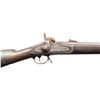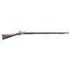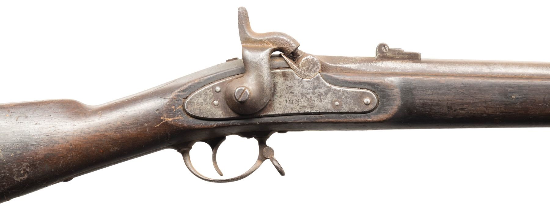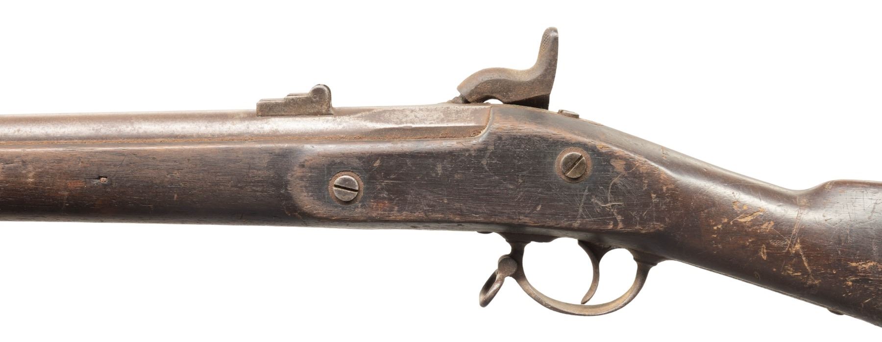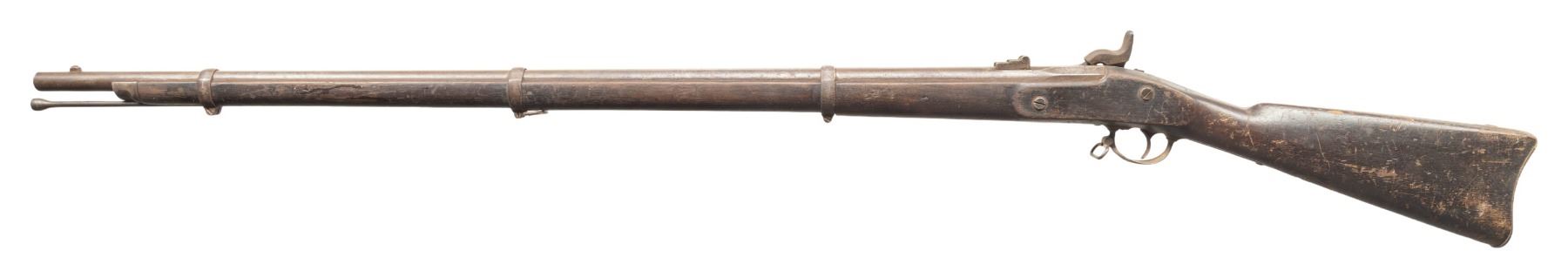 1861 CONTRACT RIFLE-MUSKET. Cal. 58. NSN. Bbl. 40". Barleycorn front sight & leaf rear sight. 3 Band walnut stock w/ iron furniture & trumpet tipped ramrod. CONDITION: metal has gray patina appearance with pitting around lock. Wood has worn finish with numerous gouges, marks & crack behind wrist. Pitted bore. (01-28308/MD). ANTIQUE. $300-500.