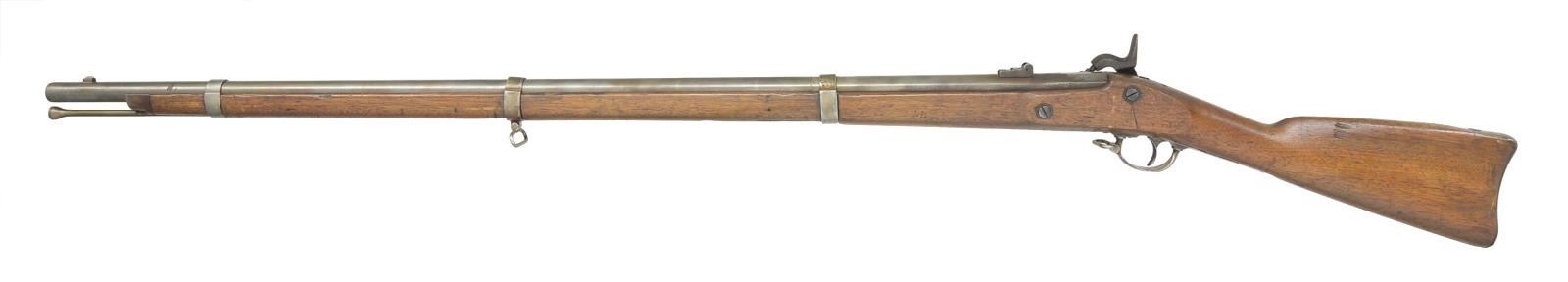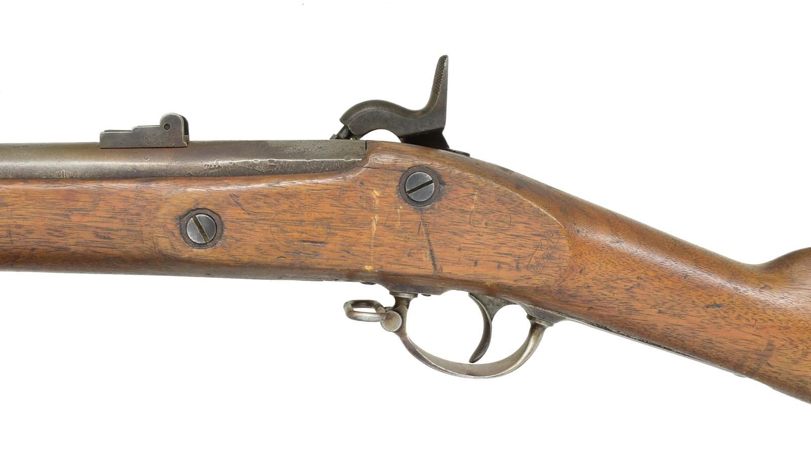 Cal. 58. NSN. Bbl. 40" standard configuration w/ adj. rear sight, flat bands. CONDITION: good to very good overall. Appears original & complete, cleaned gray metal, good lock markings. New nipple. Stock is sound w/ scattered storage blemishes w/ discernible inspector cartouches & makers mark. Mechanically crisp w/ good rifled bore. (01-19441/JS). ANTIQUE. $700-900.