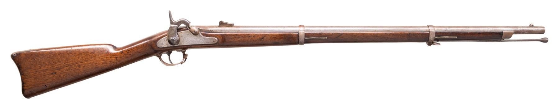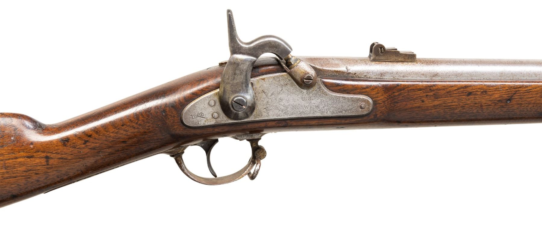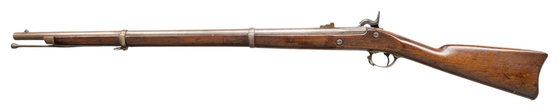 Cal. 58. NSN. Standard configuration 48" overall, 32" shortened barrel, dated 1865 at breech, lock "US / NORWICH" and "1865" at tail. Iron furniture, buttplate has US surcharge, 2 barrel bands, walnut stock has 2 inspection cartouches. CONDITION: very good, refinished & varnished stock, complete & matching, swelled ramrod cut down with no threading. Mechanics fine, good rifled bore. (01-28574/JS). ANTIQUE. $600-800.