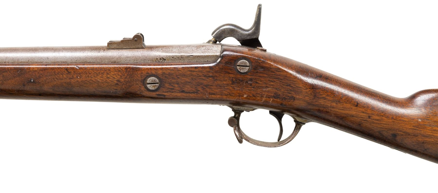 Poor: No original finish, possibly some major parts replaced, loose but functional mechanics, active or heavy external rust, poor bore with heavy pitting and little or no rifling visible.