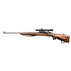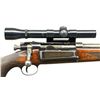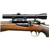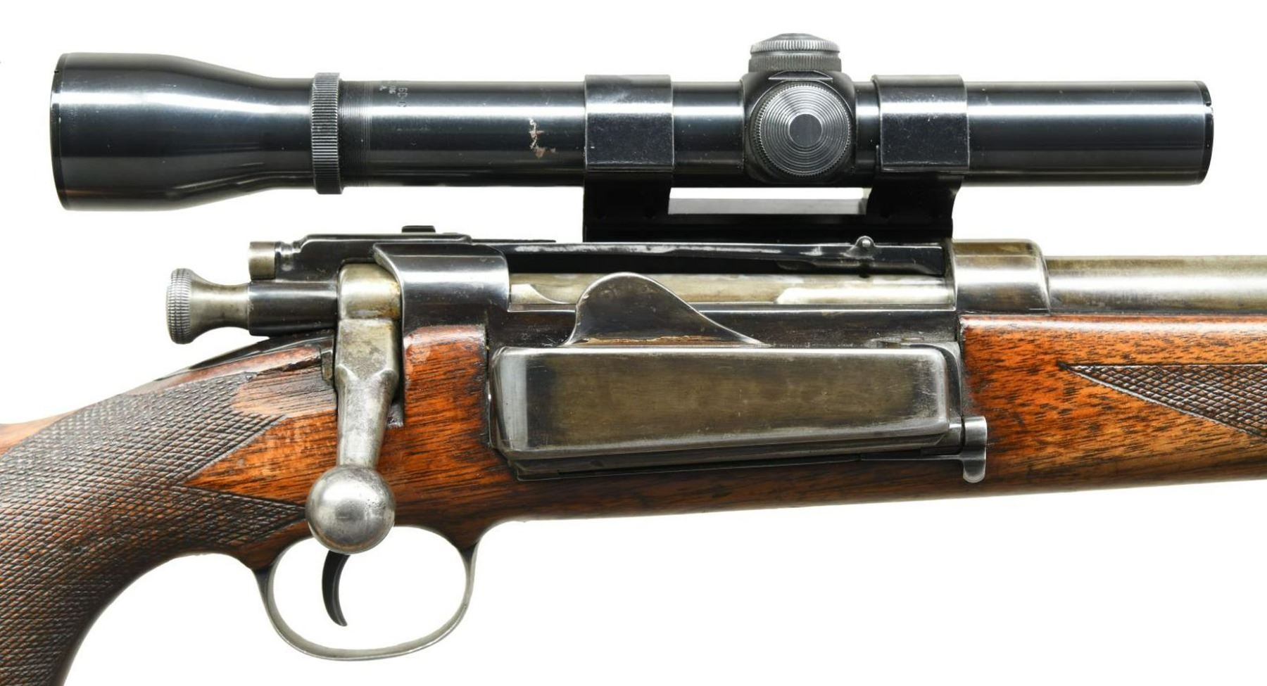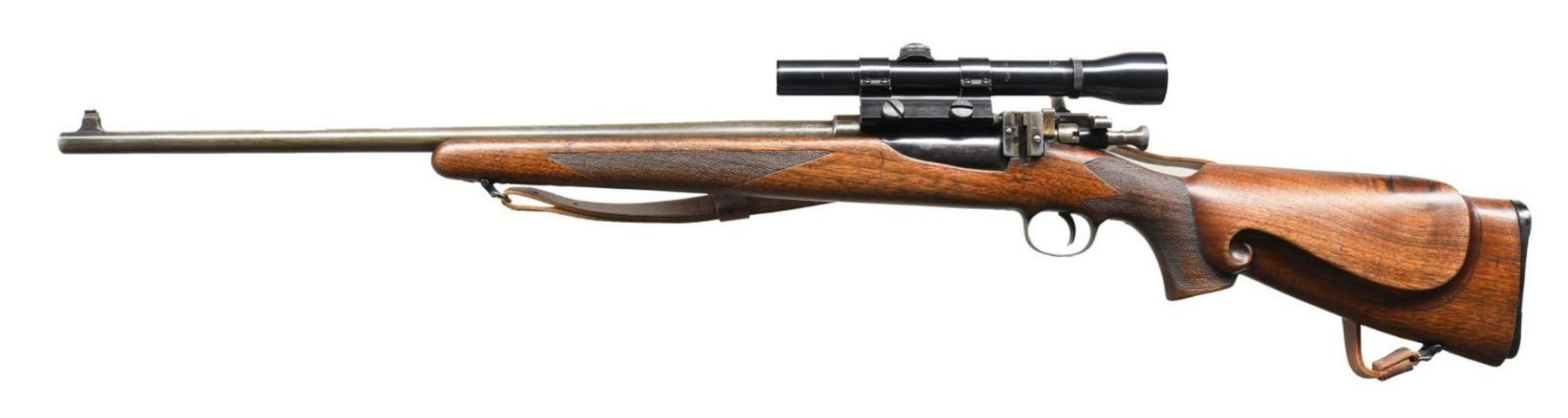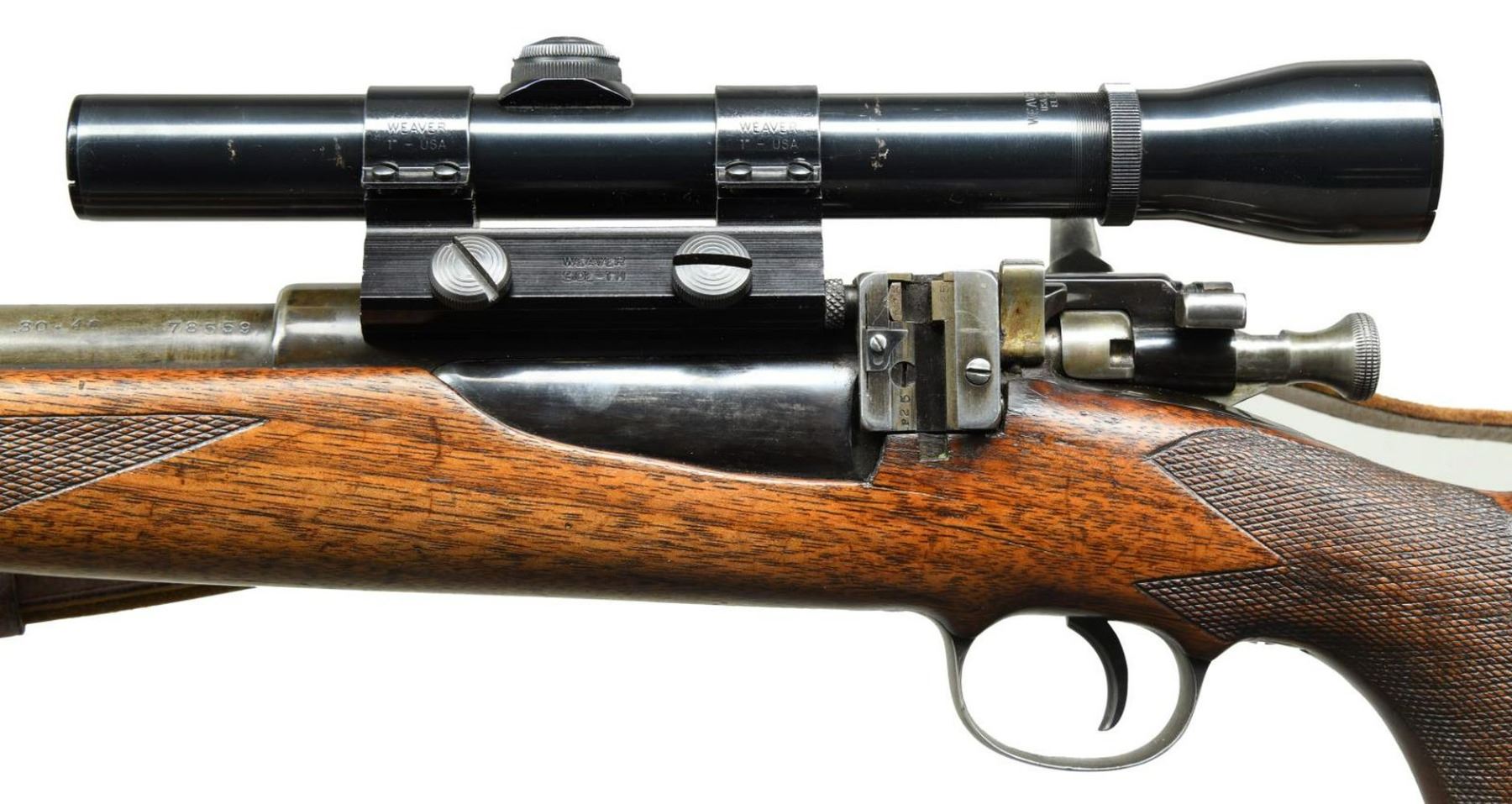 RIFLE. Cal. 30-40 Krag. S# 78559. Bbl. 22". Sporterized Krag rifle. Left side of bbl. marked "CAL. .30 .40" & "78559". Bead front sight. Left rear of receiver has base for aperture rear sight but no sight present. Left side of receiver has Weaver K3 scope w/ post reticle & very good optics. Checkered Monte Carlo walnut stock w/ left side cheekpiece & bottom mounted sling swivels. Leather sling. Poorly fitted grooved black buttplate. CONDITION: stock has a notable chip behind bolt cutout, a large patch repair on left side of cheekpiece, the remnants of an older added finish, a couple notable repaired cracks behind sideplate, scattered handling marks & dings. Metal is mostly a gray patina w/ strong amounts of an older reblue in receiver area & some light oxidation. Worn bore w/ scattered oxidation & pitting. (23-2671/MJC). MODERN. $300-450.