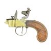 Overall: 5 1/2". Brass boxlock action w/ center mounted hammer & large pan. Walnut bag type grip. CONDITION: brass has pleasing patina with light marks. Action appears to function when cycled by hand. Hammer & frizzen has gray patina appearance light marks. Screws show light distortion. Bottom of pan has dark patina. Good varnish on grip w/ a few impressions. (02-19562/MD). NON-GUN. $300-500.
