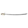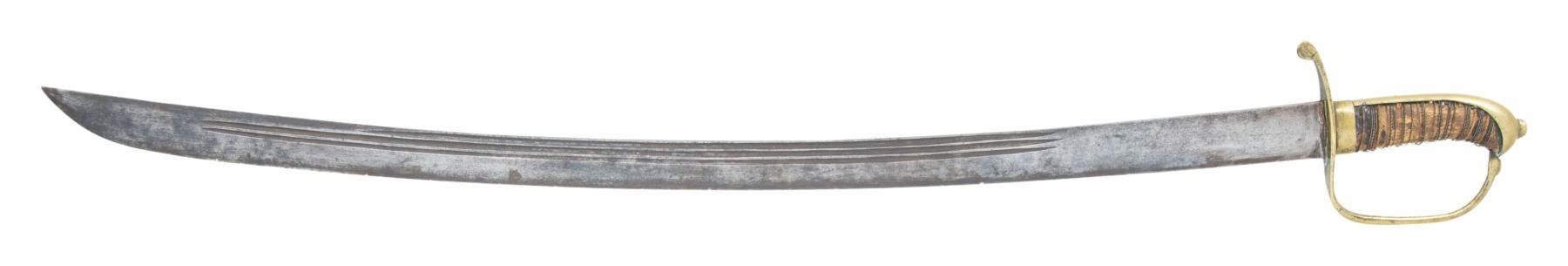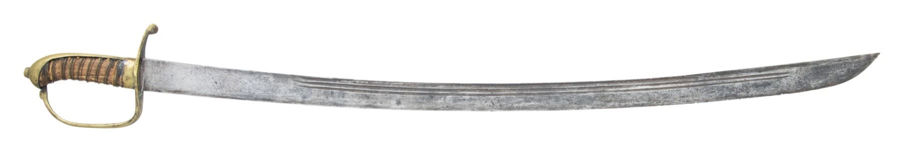 A well used veteran of several wars, this late 18th century European horseman's saber is often associated with Germany or Holland but just about every European country had a version of this classic design. It measures 38" overall with a plain 32 1/2" three fullered blade that is likely German made. Brass hilt with a small down turned quillon and plain guard, knuckle bow and back strap. Plain bird's head pommel with a raised capstan. Wire wrapped leather grip and no scabbard. CONDITION: blade has a gray patina with a few nicks the edge. Hilt has a pleasing patina. Grip has only a trace of leather remaining with portions of the cord that remain exposed and the wire dislodged. (02-25200/BF). 1000-1500.