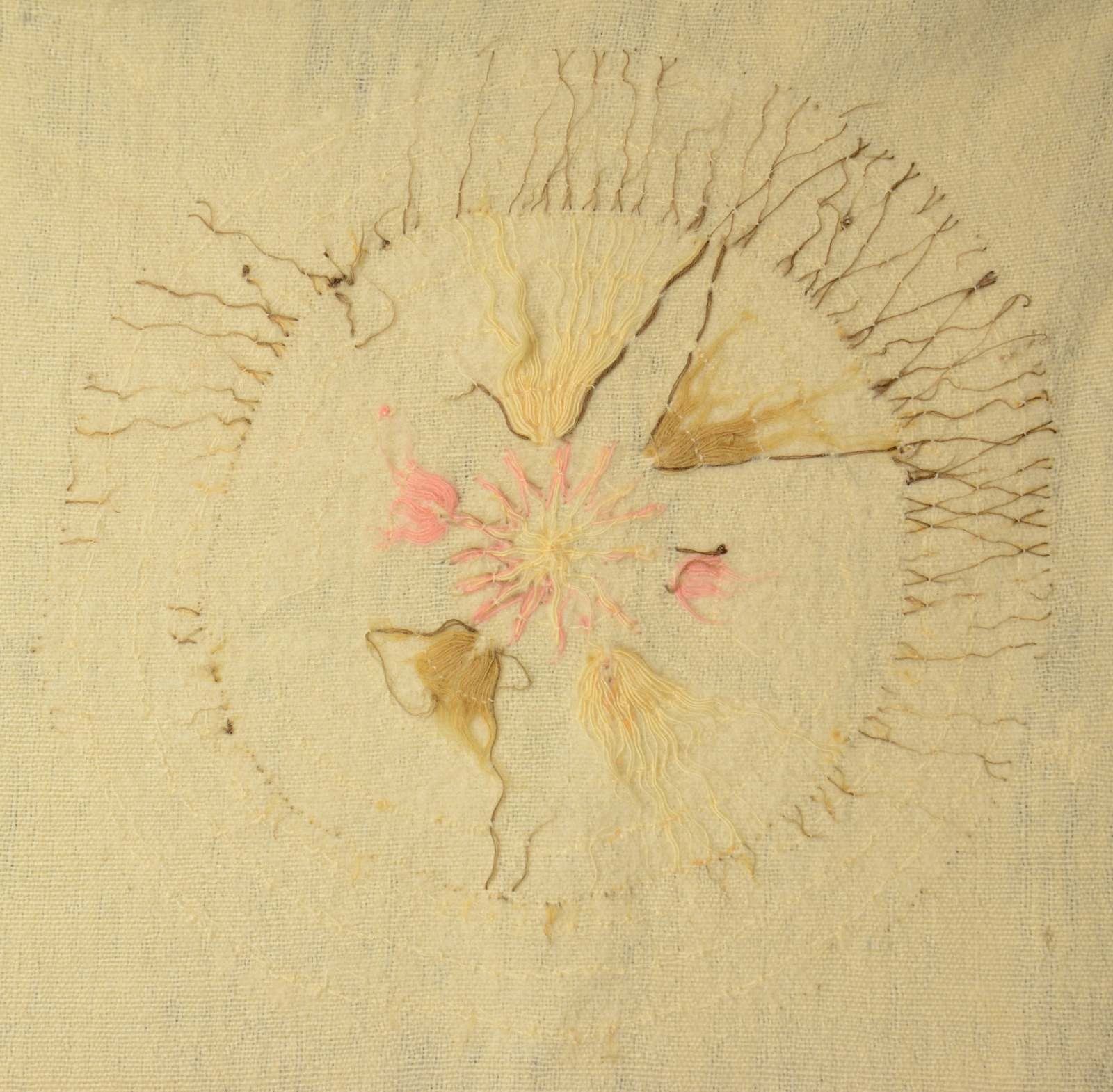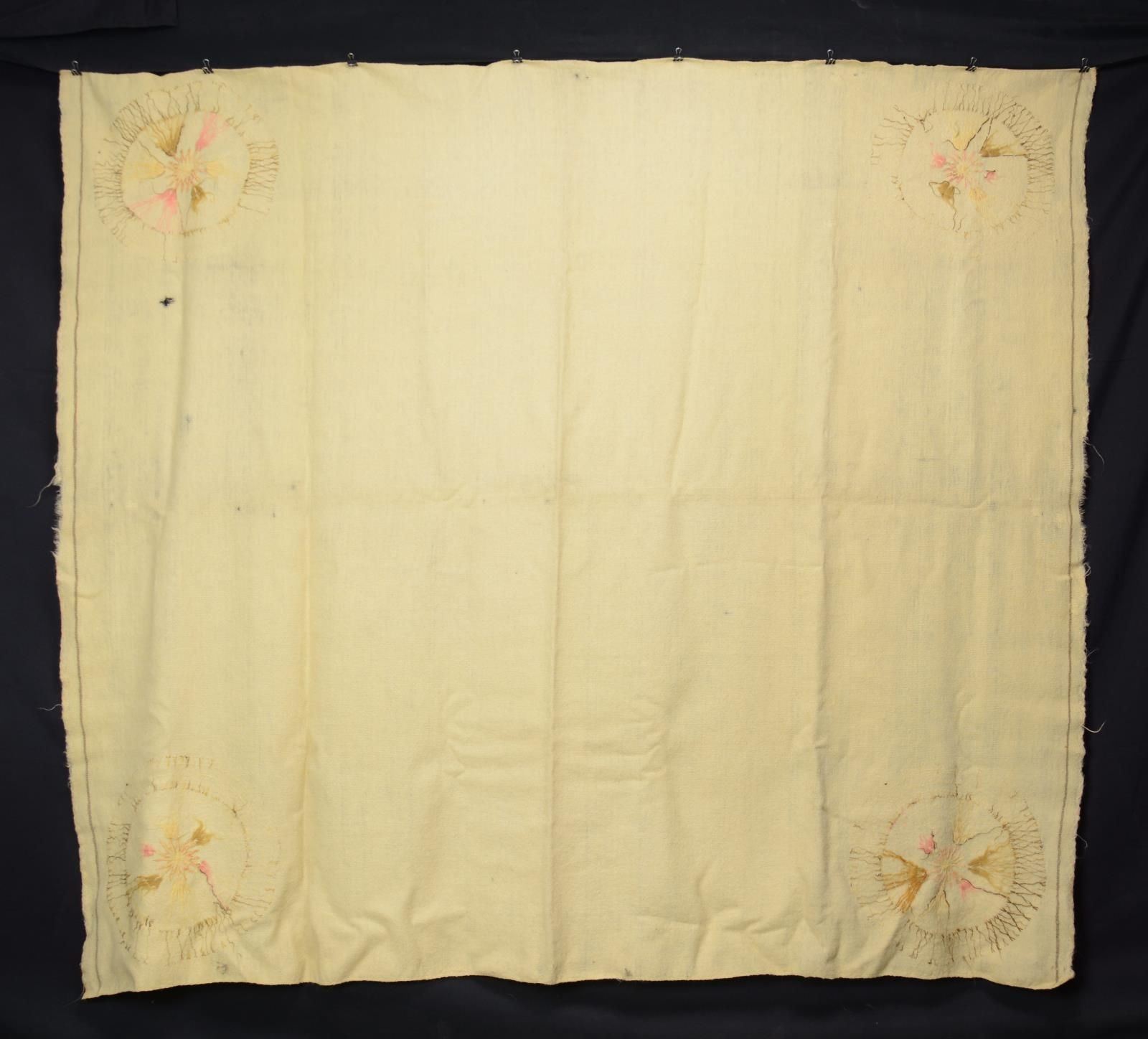 Wool, about 80" x 70", abstract "Rose" embroidered design on 2 corners. Similar example found at Mt. Vernon. Pictured on page 176 in "The Fur Trade". Author, Milton von Damm: "Rose blanket, circa 1790's. It has one thin brown stripe at each end and a rose design in each corner. Such blankets were presented as gifts to Indian Chiefs for personal use by traders." CONDITION: good overall, much fraying and losses to embroidered panels. PROVENANCE: Lifelong Collection of author Milton Von Damm. (02-22260-1/JS). $400-600.