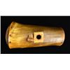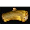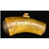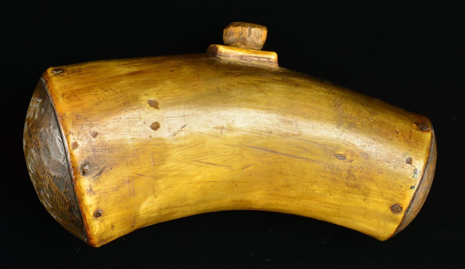 Well made liquid container form, about 6.5" x 3.5" section of horn w/ 2 convex wood plugs, about 1 1/4" attached bone or ivory spout & carved wood stopper. Carved in the larger of the 2 wood plugs: “LT. PATRICK WELSH / 1ST NY RGT /OSWEGO / 1762”. This horn is being sold as-is and no warranty as to date created. UNATTACHED ACCESSORIES: research file & some history of Patrick Welsh. CONDITION: good to very good overall. (02-13803). $600-800.