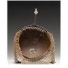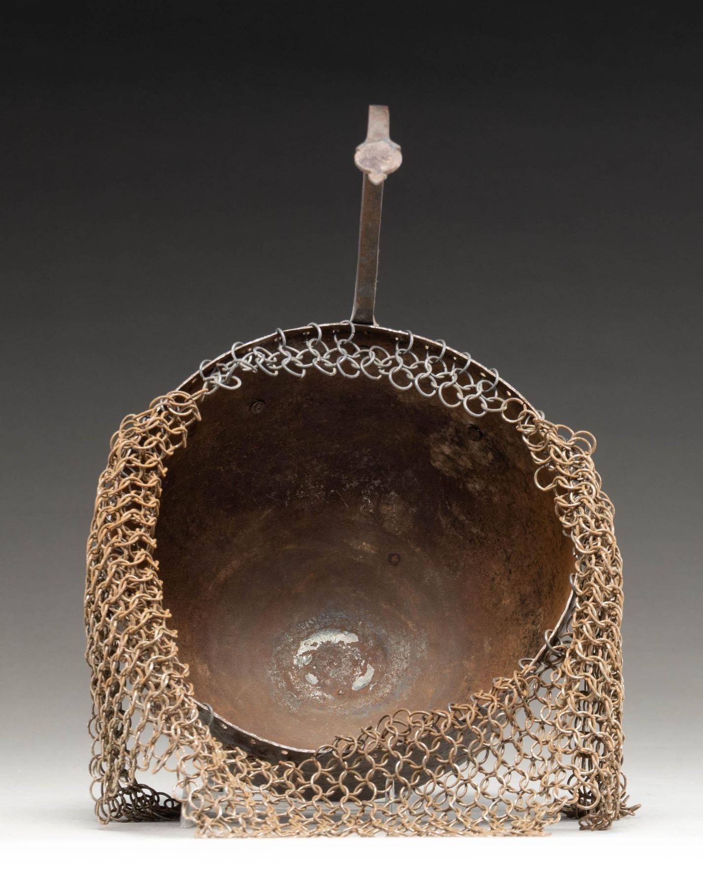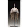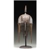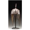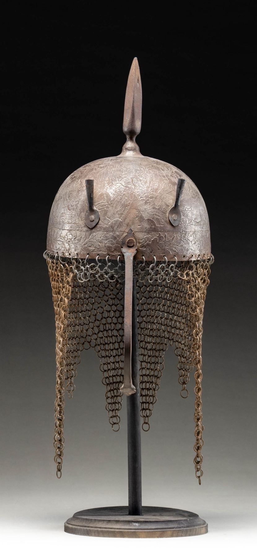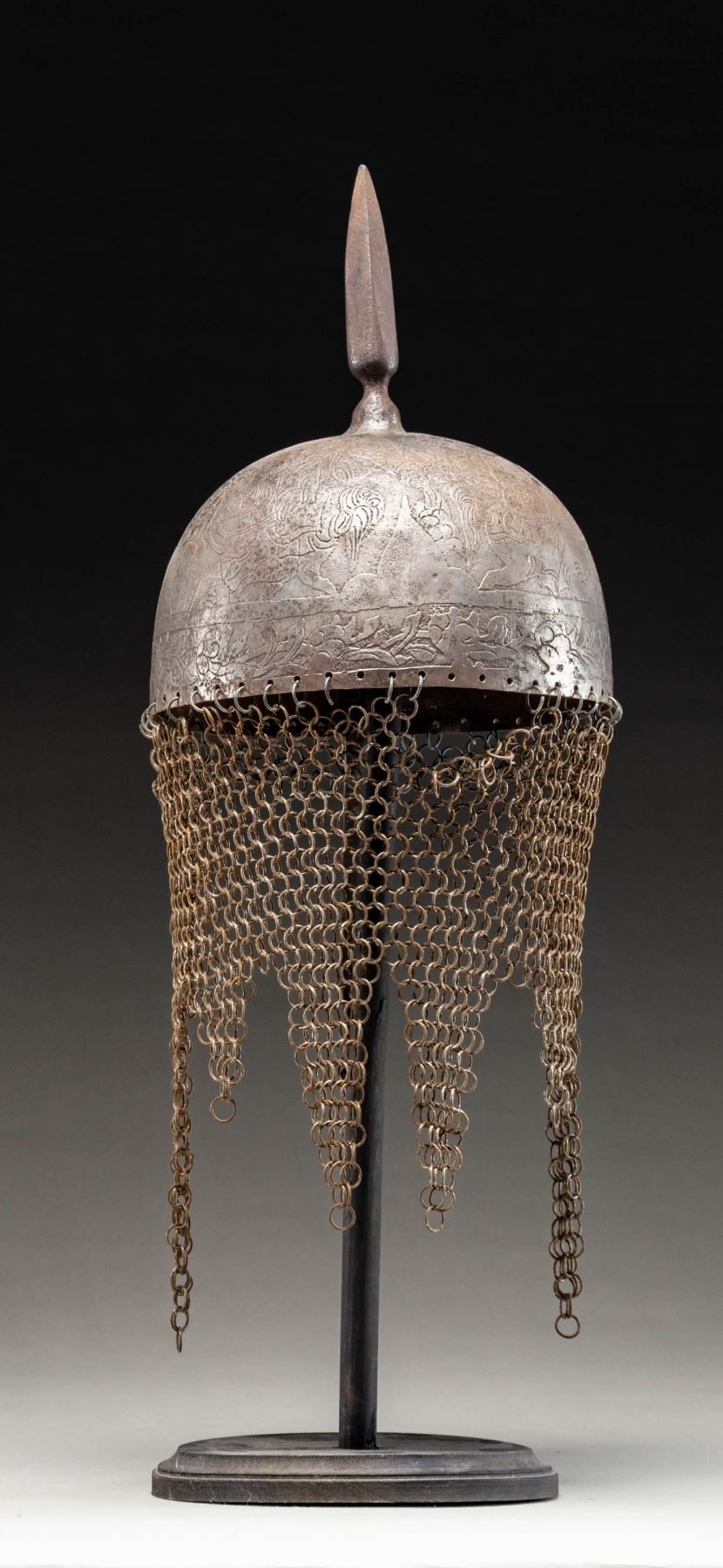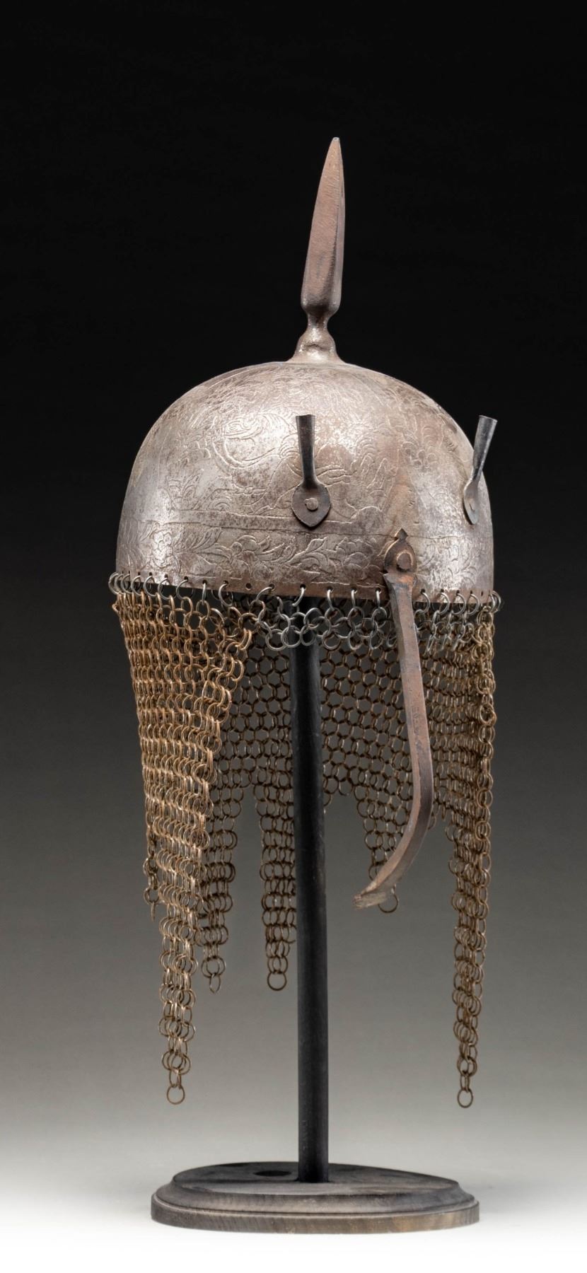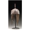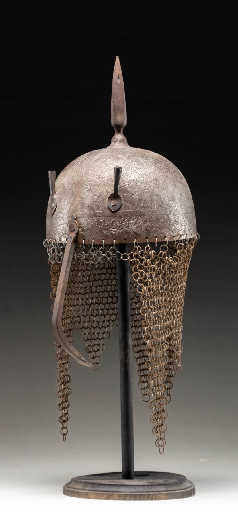 This fine Persian steel helmet measures approximately 19" from the base of the aventail to the top of the spike. The spike has 4 facets and the skull is decorated with foliate motifs and mounted soldiers. There are 2 plume holders attached to the skull as well as a pivoting nasal bar. The aventail has 6 point to the base and is quite well done. There is no liner attached to the helmet. CONDITION: the helmet is very solid. All parts of the helmet has a somewhat oxidized finish. The aventail appears complete. (02-24625/BF). NON-GUN. $400-600.