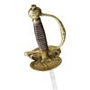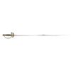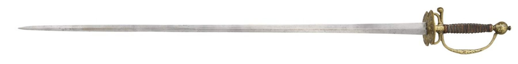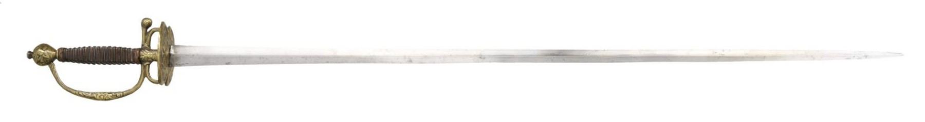 Overall length: 42”. Blade length: 35”. Plain blade with a raised medial ridge. Brass hilt with a double kidney shaped guard featuring sprays of arms & trumpets on the underside with sprays of arms alone on the top. Drop pendulous quillon with tall pas d’ane. Knuckle bow has central scroll & foliate decoration. Spherical pommel has a similar motif as seen on the guard. Iron wire-wrapped grip alternating with copper tape. Copper Turk’s head knots at the top & base of the grip. No scabbard. CONDITION: blade has a light gray patina with scattered peppery staining. Hilt has been cleaned & coated with a preservative. Grip is 100% intact. (02-20058/BF). $500-800.