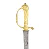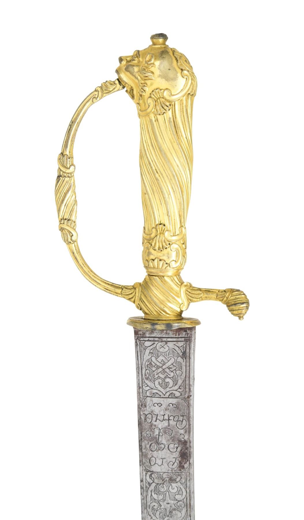 CUTTOE. Overall length: 27". Blade length: 21 3/4". Blade has a single, rudimentary fuller near the spine. It is etched on both sides with allegorical motifs and the words "Pro Deo et Patria." There is also one game animal etched on each side of the blade. Heavily gilded gargoyle hilt in the rococo style. At one time, the sword had a downturned clamshell guard that has been removed, possibly during its useful life. Classical rococo designs are utilized throughout the hilt and blend well with the austere gargoyle pommel. No scabbard. CONDITION: blade has a medium gray patina with scattered areas of darker staining. Hilt retains well over 90% of its original gilded finish and remains quite tight. (02-23022/BF). $500-800.