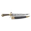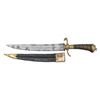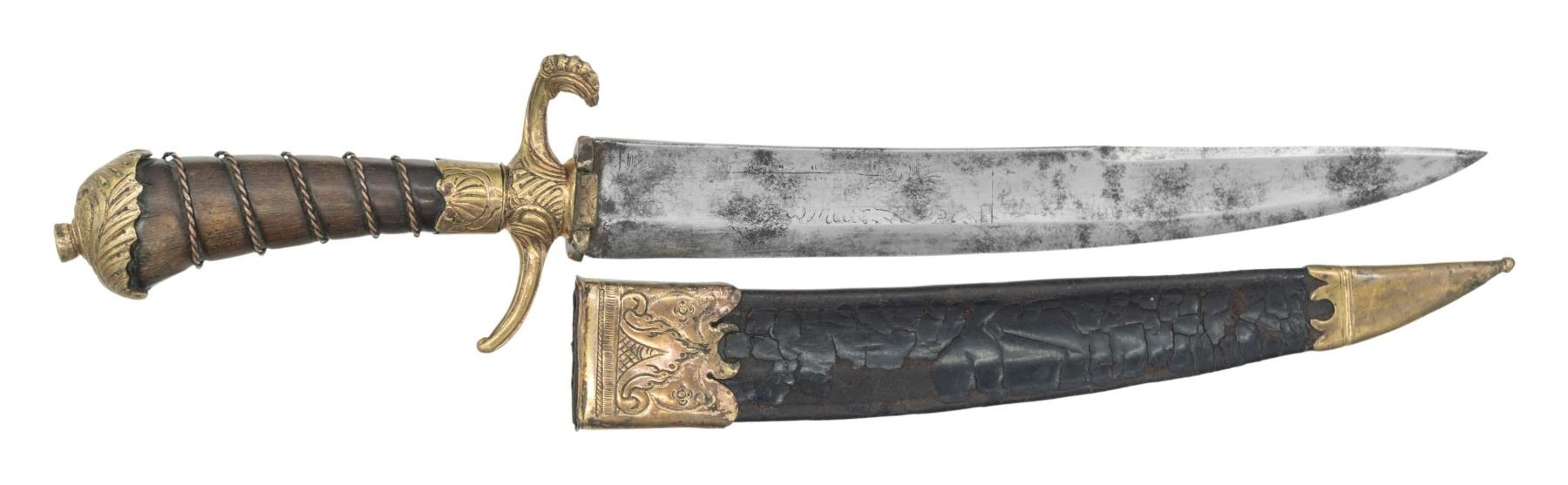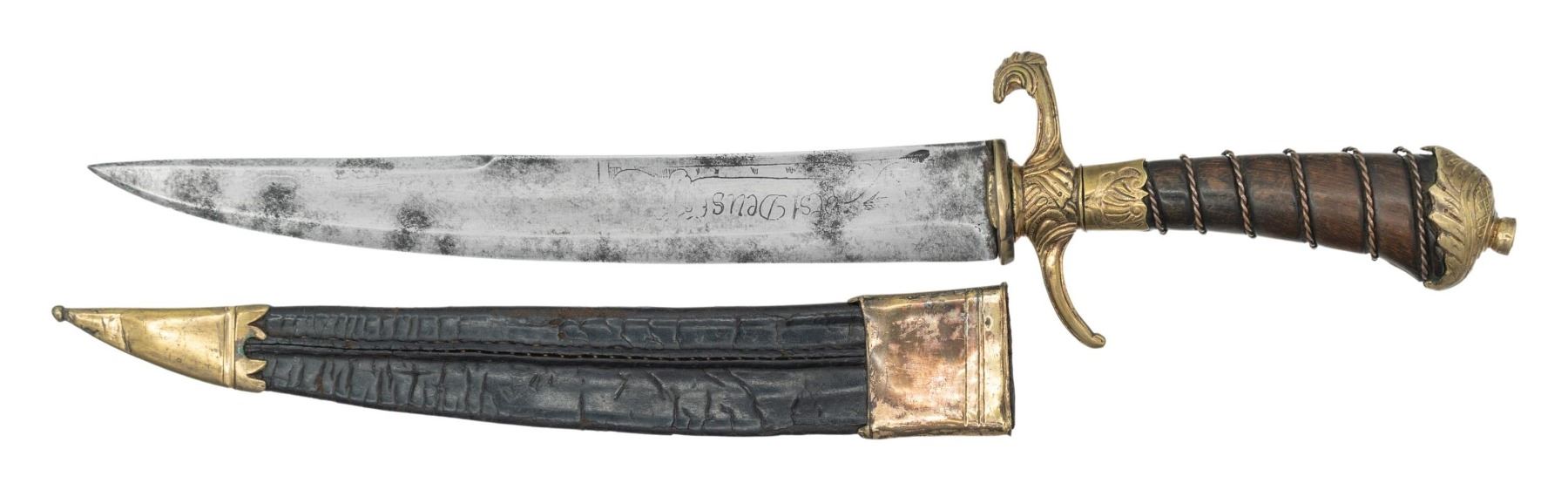 SWORD. This very interesting side knife was adapted in the 18th Century for use as a side knife. This can plainly be seen by the grind of the blade and the removal of most of the knuckle bow. The sheath fits the knife perfectly indicating 18th Century creation of this side knife. The entire knife is 15 1/2" overall with a 9 1/2" blade and 4" false edge. The single fullered blade has visible engraving that is somewhat difficult to discern. The word "St. Deus" can be clearly seen and likely refers to Saint Deusdedit; a 7th Century Pope known for helping the poor. Brass crossguard with a decorated quillon on one end, and a shortened knuckle bow forming the other side of the crossguard. There is a similarly decorated ferrule and pommel cap with a copper wired wrapped wooden grip. Gilded brass mounted leather sheath with a highly embellished throat. CONDITION: blade has a gray mottled patina. Brass has a pleasing mellow patina with traces of original gilding present. Grip shows light wear. Sheath body is crazed and a bit flaked and the gilded brass mounts show expected wear. (02-25889/BF). NON-GUN. $400-700.