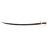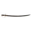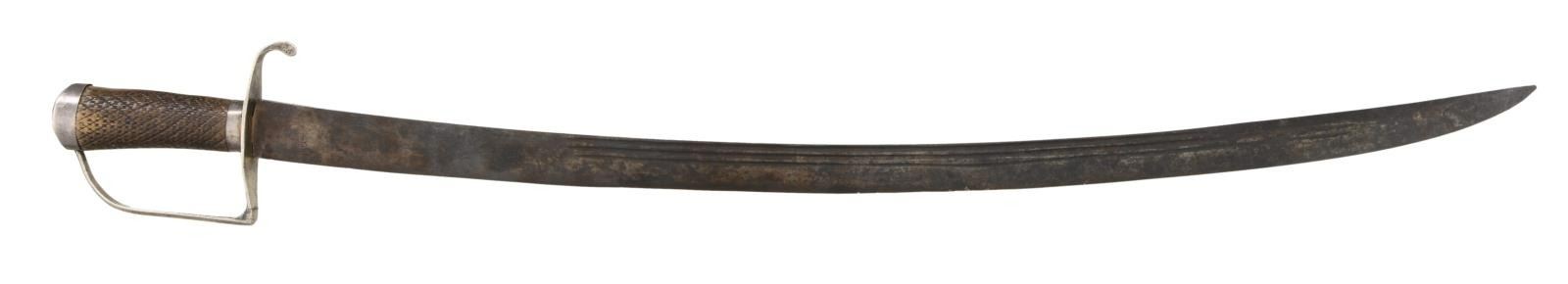 Overall length: 35 3/8". Blade length: 30 3/4". Blade has triple narrow fullers that have historically been associated with Spanish manufacture, but have been recently shown to be of German manufacture. These blades were imported in large numbers to this country during the Colonial and early Federal period. The blade is decorated near the hilt with several talismans including the sun, moon & stars, the arm & sword in a cloud, and more stars. The blade is signed but is somewhat illegible due to wear. The signature appears to be "V.HRSCHL___". Silver hilt with plain crossguard & downturned quillon. Plain chamfered knuckle bow leading to a plain pommel cap. Wood grip with carved checkered design. No scabbard. CONDITION: blade has a dark medium gray patina. Engravings remain generally clear. Hilt is loose and a bit misshaped. Grip shows light wear. PROVENANCE: From the Collection of James B. Taylor. (02-19885/BF). $600-900.