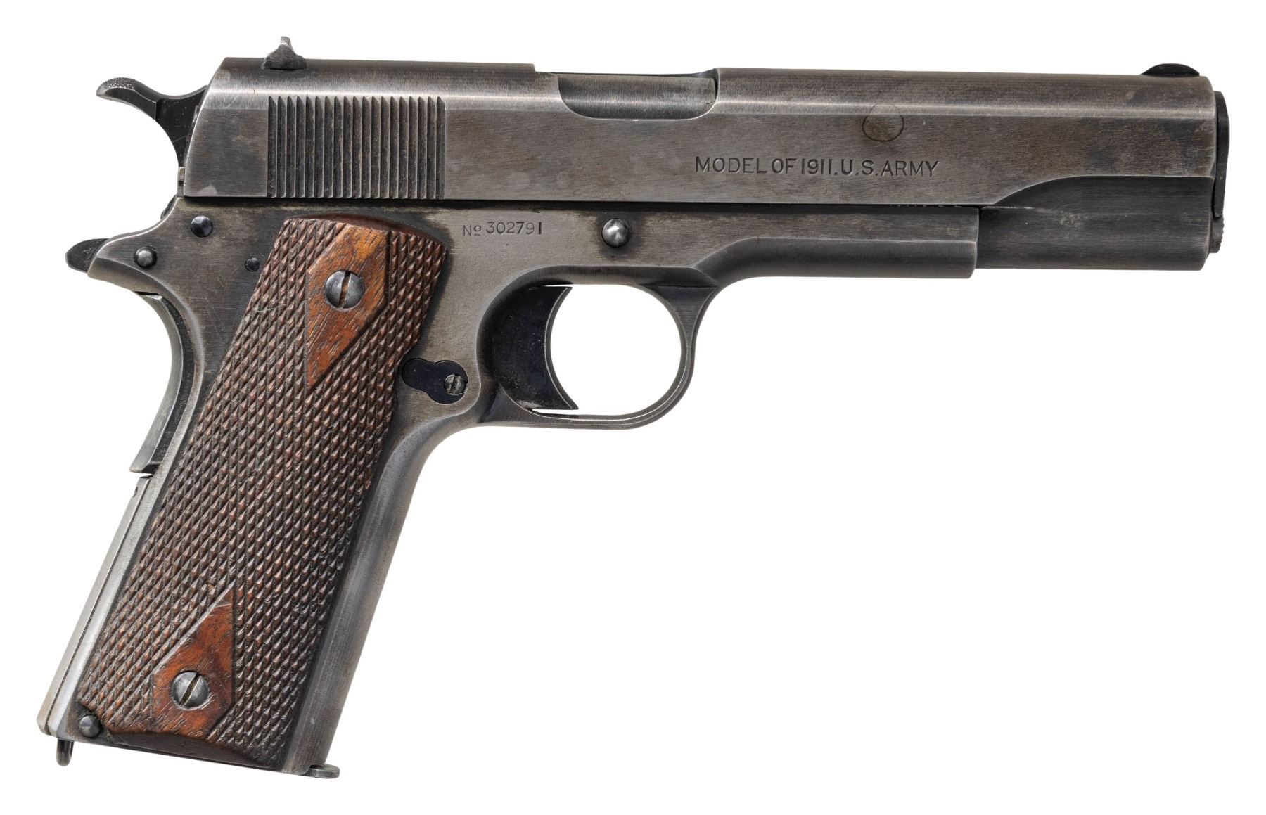 Cal. 45 ACP. S# 302791. Mfg. 1918 w/in S# range 223,601-580,600. Per, "U.S. Pistols & Revolvers 1909-1945" by J.C. Harrison, this pistol has most correct parts; 5" barrel appears Colt, however is stamped "R" over "P" on top. MAGS: 1 two toned 7 rd.; good blue finish with friction wear & patina spots. CONDITION: approx. 30% original blue on slide with finish fading to gray patina with 1 stain spot on right side along with light scratches. Approx. 50% original blue on frame predominantly under grips with worn finish in handling areas & peppery oxidation in grip panel areas. Barrel has fair original blue with replacement barrel link pin that is loose to lugs; good rifling with some light residue in grooves & wear to lands. (25-5382/MD). CURIO. $1,000-1,500.