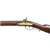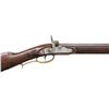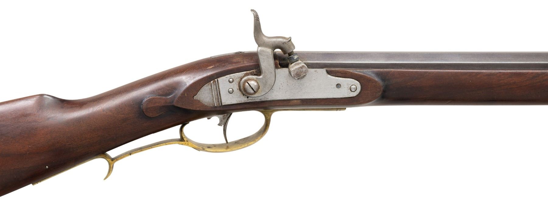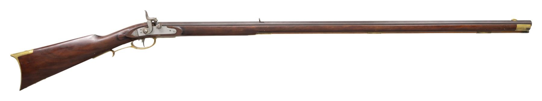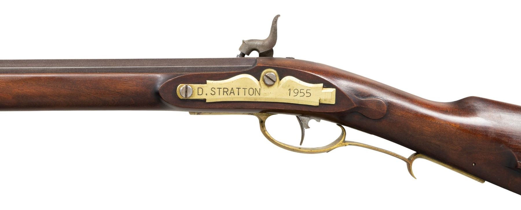 KENTUCKY RIFLE. Cal. 36. NSN. Oct. 39.5" w/ brass blade front sight & semi buckhorn rear sight. In the white rebated lock. Brass sideplate engrave "1955 D. STRATTON". Full length pinned walnut stock w/ tear drops behind lock & sideplate, left side cheekpiece & hardwood ramrod. Brass furniture includes crescent buttplate, toeplate, finger curl triggerguard, thimble, nosecap & 2 ramrod pipes. CONDITION: barrel has good antique brown finish. Lock shows patina on edges. Very good wood finish with light dings. Very good modern style rifling. PROVENANCE: From the Buckstix Collection. (01-28649/MD). ANTIQUE. $500-750.