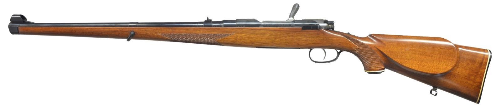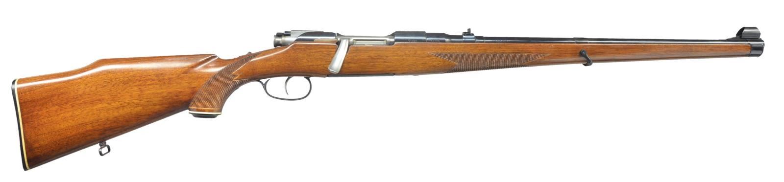 270 WINCHESTER WITH TANG SAFETY. Cal. 270 Win. S# 46826. Bbl. 20". A high condition example of this 60’s classic, an “improvement” over the early style w/ swept bolt handle, Monte Carlo comb & “toilet seat” cheek piece. This carbine also has single trigger & white line spacers for buttplate & grip cap. This model also features a removable dummy sideplate for scope mounting, along w/ mounting holes drilled & tapped on receiver ring & left side of bridge. This carbine also has the scarce tang safety, only available in the last couple of years of production; otherwise old sights & markings are factory original. CONDITION: exceptionally fine w/ only a few very minor marks in metal finish, mostly evidence of screw driver use. There are also some light marks & scratches in original wood finish. Checkering is clean & sharp. Bright, shiny bore. Mechanically smooth. (21-3280/MGM). CURIO. $1,400-2,200.