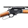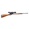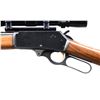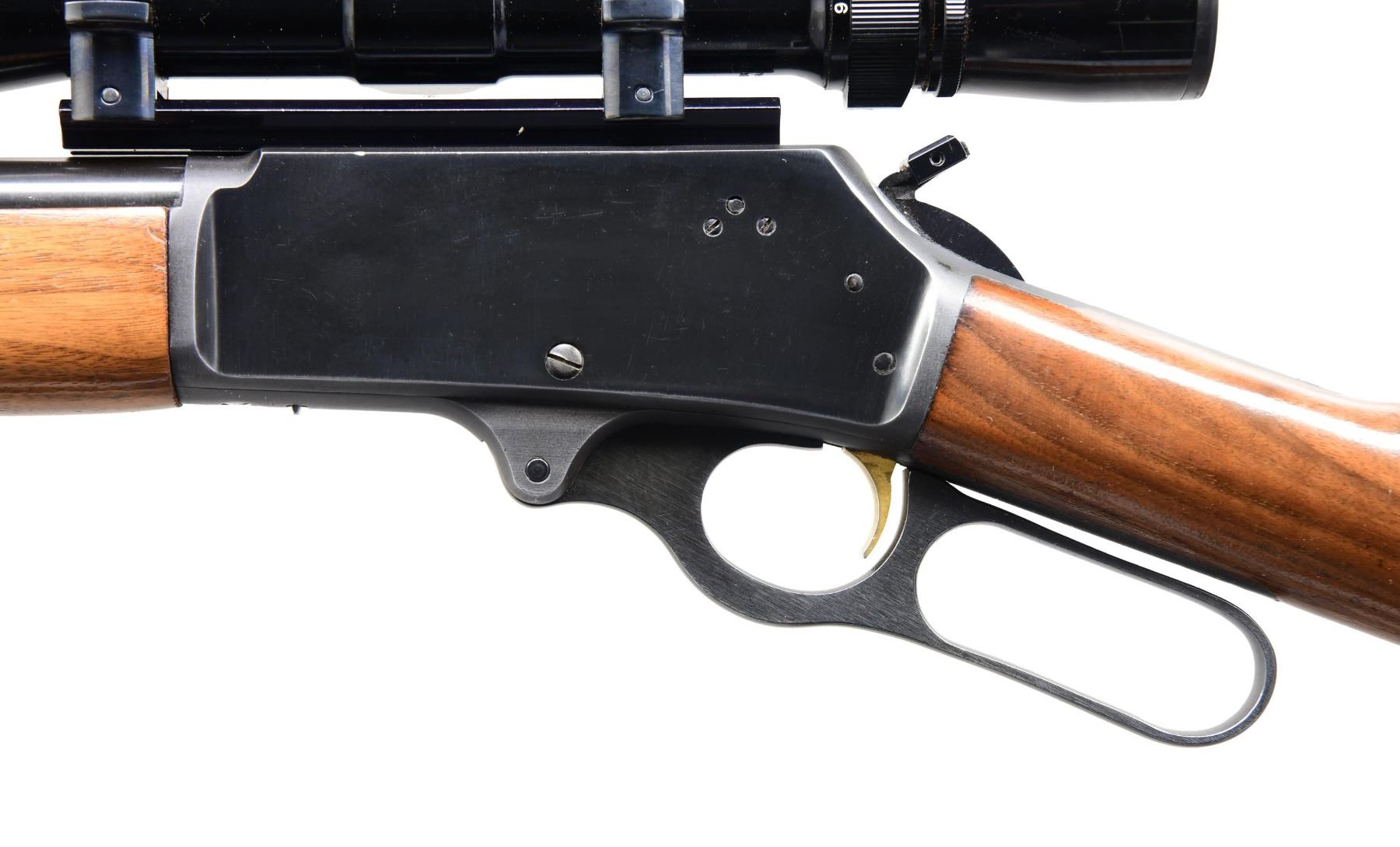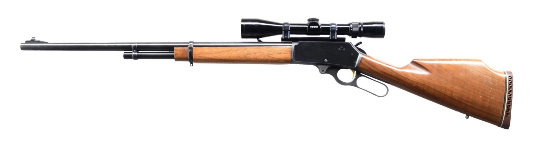 RIFLE. Cal. 444 Marlin. S# 70111981. First model mfg. in 1970 & has a Marlin 1870-1970 medallion in right side of buttstock. Micro-Groove 24" barrel with bead front sight & flip up rear sight. Weaver CV9 Micro-Trac 3-9x38 scope with duplex reticle on 2 piece rings & Weaver style base. Gold anodized trigger. Walnut forearm & straight grip Monte Carlo buttstock w/ Marlin ventilated recoil pad & sling stud; "bullseye" missing. UNATTACHED ACCESSORIES: Scope cover. CONDITION: very good to near excellent metal finish with light handling marks. Very good wood finish with light handling marks. Near excellent bore. (24-3176/MD). CURIO. $600-900.