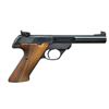 Cal. 22LR. S# 2460842. Bbl. 5.5" Heavy. Mfg. 1974. Very desirable self-loading rimfire target pistol. Push button, quick change barrel. Bright blued finish on barrel & slide w/ matte black finish on frame. Bull barrel w/ adjustable target sights. Serrated slide w/ left-side thumb safety. 2 piece checkered hardwood grips w/ left side thumb shelf. Bottom mag release. Extremely light trigger w/ no over-travel. MAGS: 3 steel 10-rd. UNATTACHED ACCESSORIES: Black nylon Bulldog pistol bag. Paperwork include: 2011 High Standard repair invoices & 1972 dated photo-copied owners manual. CONDITION: Finish coverage is complete & consistent. Some light thinning at muzzle & on high spots. Bright bore w/ strong rifling. (22-5547/JZ). MODERN. $350-550.