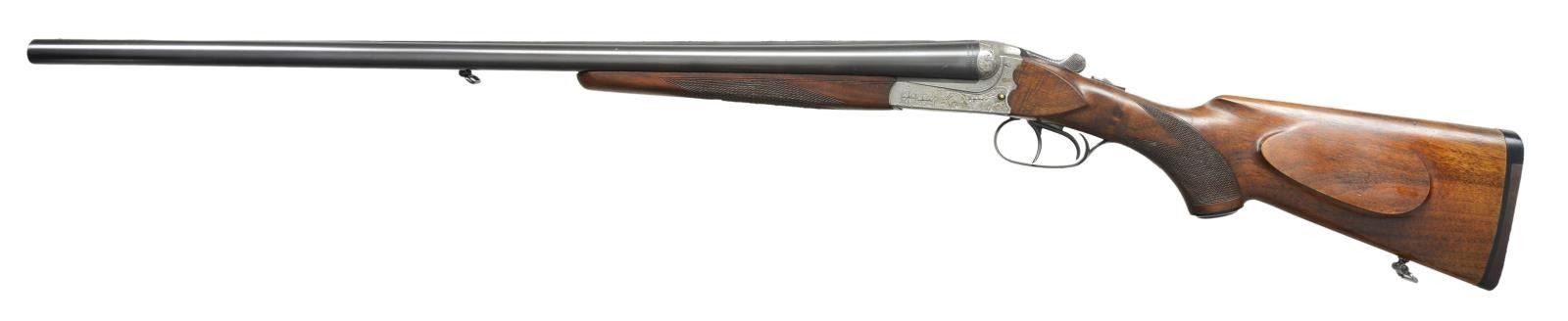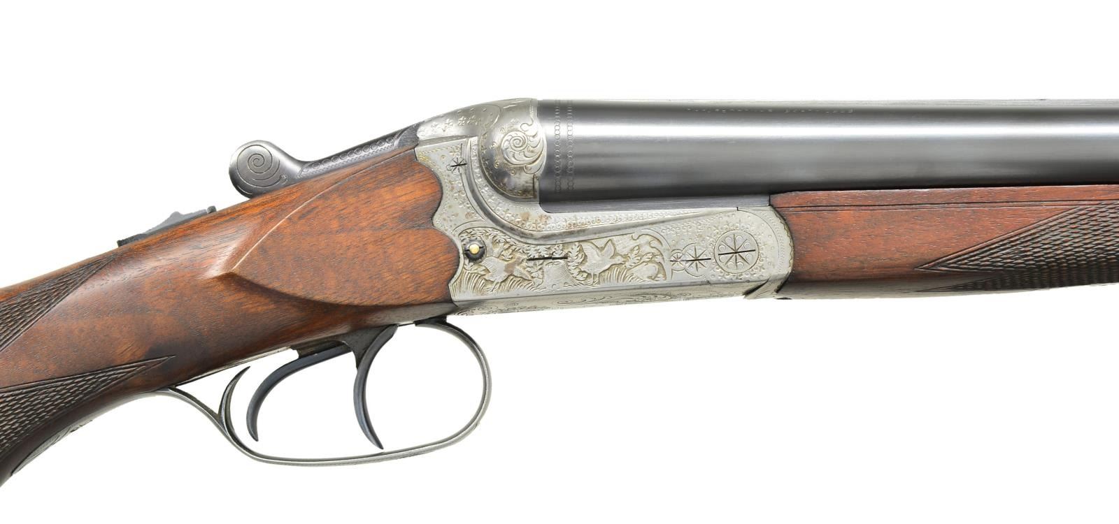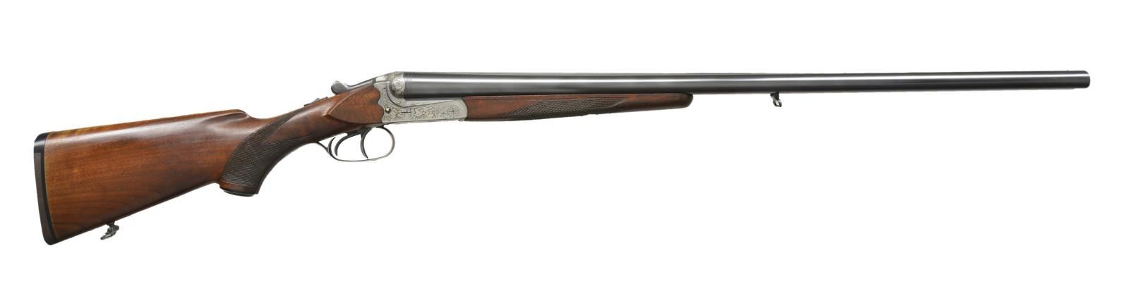 Cal. 12 Ga., 2 3/4". S# 787385 (1183 = Nov. 1983). The import marked 28" bbls. have matted rib & white bead. Full & IM chokes. Scalloped boxlock action w/ Greener style crossbolt, dbl. triggers, ejectors, cocking indicators & automatic safety. Action has fleur de lis border engraving highlighted by geometric patterns & floral scroll. Action engraving presents 2 woodland scenes featuring grouse & pheasants along side Merkel logo on floorplate. Engraving extends to trigger guard bow & top lever featuring checkering to left side top lever panel. Splinter forearm & pistol grip walnut stock of European walnut w/ segmented checkering, cheekpiece, grip cap & sling swivel. LOP: 13 3/4" & 12 5/8" to brown recoil pad. DAC: 1 3/4". DAH: 2 3/4". WEIGHT: 7 lbs., 0.2 oz. UNATTACHED ACCESSORIES: black plastic case w/ Waffenpass. CONDITION: bbl. has very good blue w/ occasional scratch or mark. Very good gray finished action w/ spots of patina. Very good wood finish w/ light handling marks. Very good shiny bores. Action appears tight. PROVENANCE: "Save the Fine Guns". T&G German Gun Imports, bringing fine German guns to a more appreciative market. (22-6436/MD). MODERN. $800-1200.