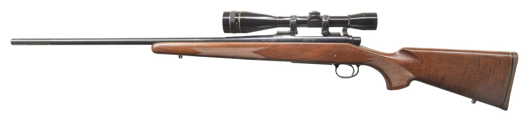 LEUPOLD SCOPE. Cal. 250 Savage. S# B6578052. Bbl. 24" w/ out sights; code "KE" appears to indicate May 1984 mfg. Leupold 1983 "gold ring" 12x, AO, crosshair scope w/ Leupold scope & bases. Push feed action w/ matching numbered bolt, internal box mag. w/ hinged floorplate. Checkered walnut stock w/ sling studs & brown Rem. pad. CONDITION: very good metal finish. Good wood finish with large scratches right side around action w/ scattered sm. dings. Very good rifling. Scope has very good finish with serviceable optics. (25-5474/MD). MODERN. $600-900.