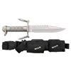 SURVIVAL KNIFE WITH SHEATH. Originally developed by Qual-A-Tec & Buck for US Navy Seals, approx. 13,008 were produced between July 1985 - Sept. 1985. Overall: 12 3/4". The blade is 7/34" long, made of 425M Steel, having a thickness of .29" & hardness of 57 plus RC scale. The right ricasso is marked "BUCK / 184 / U.S.A. / Pat's Pending". The blade has teeth on tip & spine designed for cutting meat, wood, rope & underwater fabric. The knife has a Media bead blasted finish. Stainless steel quillon & crossguard w/ 2 threaded anchor pins; rated for 275 lbs. & designed to be used an emergency anchor, secure line for gear, & Zodiac vessels. The stainless steel handle is knurled & hollow designed for water proof storage. Stainless steel knurled pommel. Buck Thermoplastic GripTite sheath w/ sharpening stone & nylon web gear. Nylon pouches contain Silva Type 12 compass w/ red lanyard & emergency matches kit. UNATTACHED ACCESSORIES: copies pages from "BUCKMASTER KNIVES / THE AUTHORIZED HISTORY OF MODELS 184 & 185" by Richard Neyman. CONDITION: knife in very good to near excellent appearance showing wear from sheath contact. Sheath very good w/ light wear. PROVENANCE: From the Lifelong Collection of Glen E. Mattox. (02-18474/MD). $800-1,200.