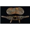 PROTECTIVE COVER. Holsters to hold lg. (15") pistols, has cartridge holders attached to outer sides. Center cut to mt. over pommel. What appears to be original protective cover is lined w/ pillow ticking & has tabs which attach to buttons on sides of holsters. CONDITION: shows considerable oxidation & loss of top grain, especially on outer cover which has tears & losses. (02-15297/MGM). $400-600.