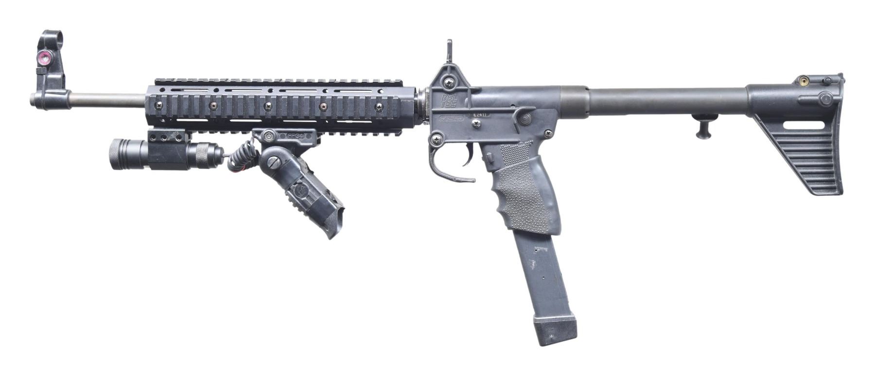 RIFLE. Cal. 9mm Luger. S# E7411. Bbl. 16 1/4". 1st Generation Sub-2000 semi-automatic rifle mfg. by Keltec. Sides of the receiver exhibit standard markings denoting Keltec's mfg. information, as well as the model and cal. designations. Black polymer receiver and buttstock, with aftermarket quad-rail forend. Forend is mounted with a CCA FFG4 folding vertical grip and an NcStar flashlight. Handguard rotates 360 degrees, but remains on receiver ring. Receiver is fitted with a Hogue textured black rubber grip sleeve. Bbl. and recoil spring tube / buttstock exhibit a phosphate finish. Standard red fiber optic blade front sight, with aperture rear sight. MAGS: 1 30-rd. Scherer Glock pattern mag. CONDITION: metal components retain the majority of their original factory phosphate finish, exhibiting some superficial handling marks overall. Mirror bore, retaining well defined rifling throughout. Black polymer furniture shows some superficial handling marks overall. (25-2274/MLW). MODERN. $300-400.