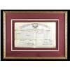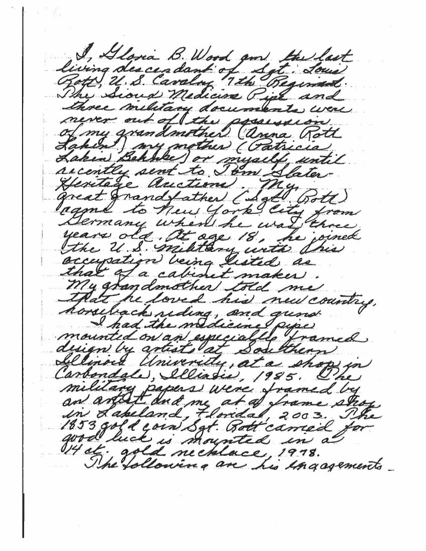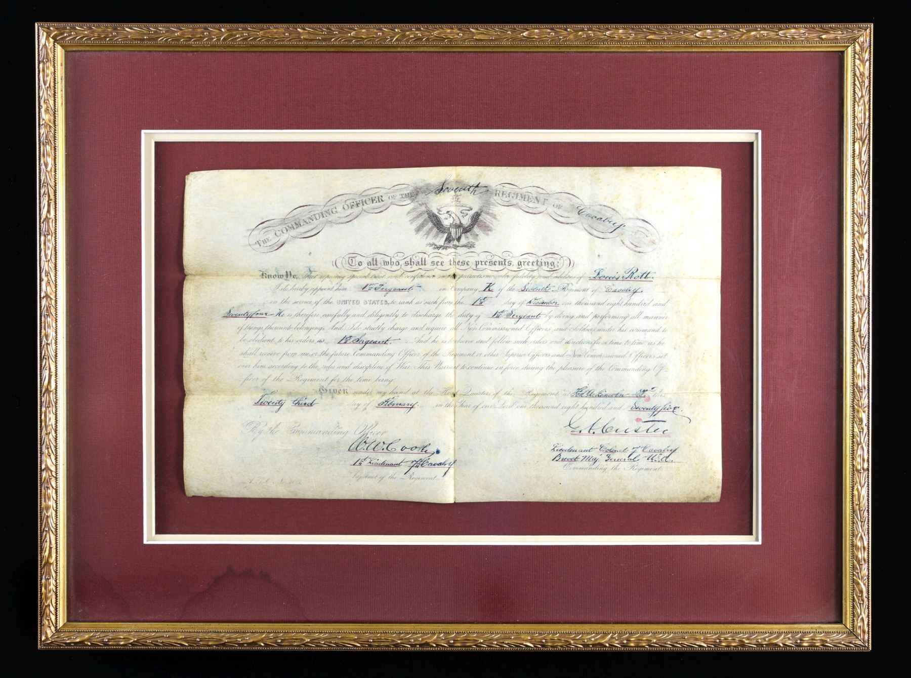 G. A. CUSTER SIGNED 7TH CAVALRY DISCHARGE, 1874. 15.5" x 10" document in 24" x 18" archival frame. Louis Rott would reenlist again in less than a year in January 1875. Louis Rott was survivor of the "Hilltop Fight" at Little Big Horn and was nominated by his commander Captain E. G. Mathey for the Congressional Medal of Honor. Several of his comrades received the medal for identical service, risking their lives retrieving water for wounded troopers during the Hilltop fight. This document, on vellum, is finely written in blue & red ink. Custer signs his name boldly as "Lieutenant Colonel of Cavalry" & "Brevet Maj. General USA.". This is rarely seen special vellum discharge instead of more commonly encountered paper. Louis Rott (1849-1897) an emigree from Germany in 1870, joined the 7th US Cavalry in 1872. His campaigns with Custer include the Yellowstone Expedition in 1873, Custer's Black Hills and Big Horn expeditions 1875-1876, and General Miles' 1877 campaign into Big Horn Valley. He left service in 1878 due to disability at Ft. Rice, Dakota Territory. UNATTACHED ACCESSORIES: copy of a letter from Gloria Wood who states she is the last living descendant of Sergeant Louis Rott and she consigned this to auction. CONDITION: archival framing not removed, therefore discharge has not been examined out of the frame. It appears that prior to framing the document was professionally reinked. Toning to vellum and cracks at folds with minor curling. Signatures of Custer and Cooke are bold and easily read. PROVENANCE: from Louis Rott, 7th US Cavalry, descent of family to last surviving member; Gloria B. Wood; Heritage Auctions 2011; Martin Lane Historic & Western Americana Lifetime Collection. (02-23299/JS). $4,000-6,000.
