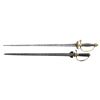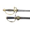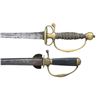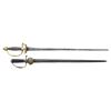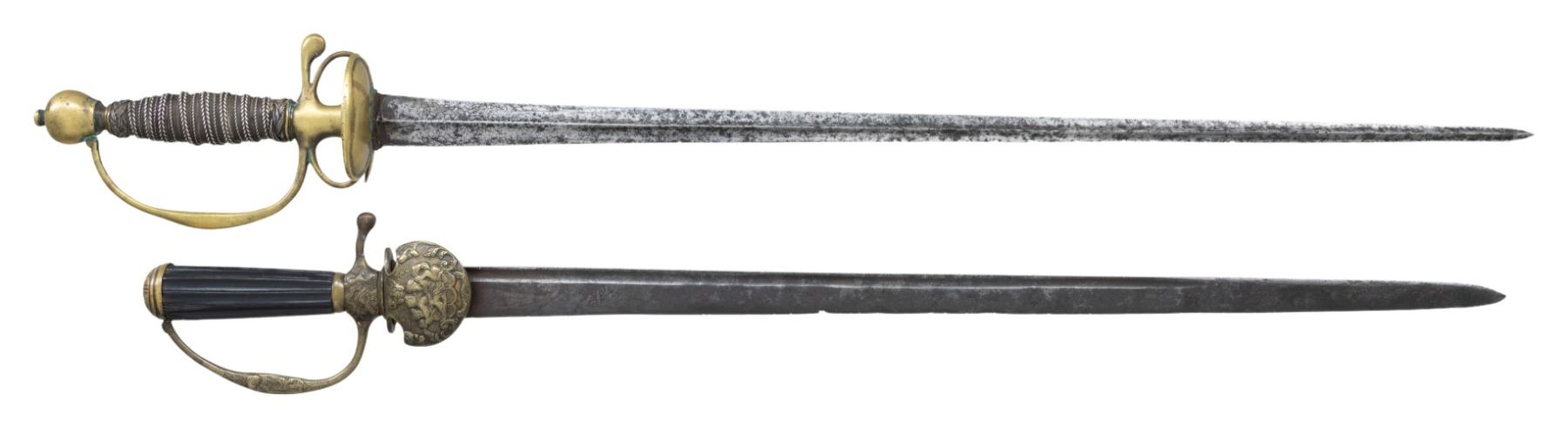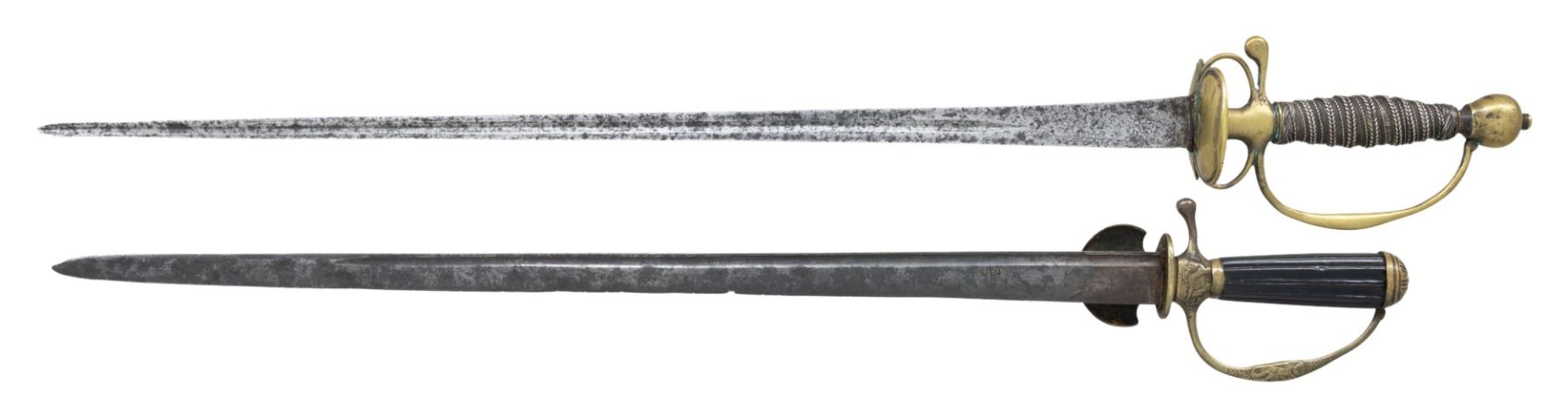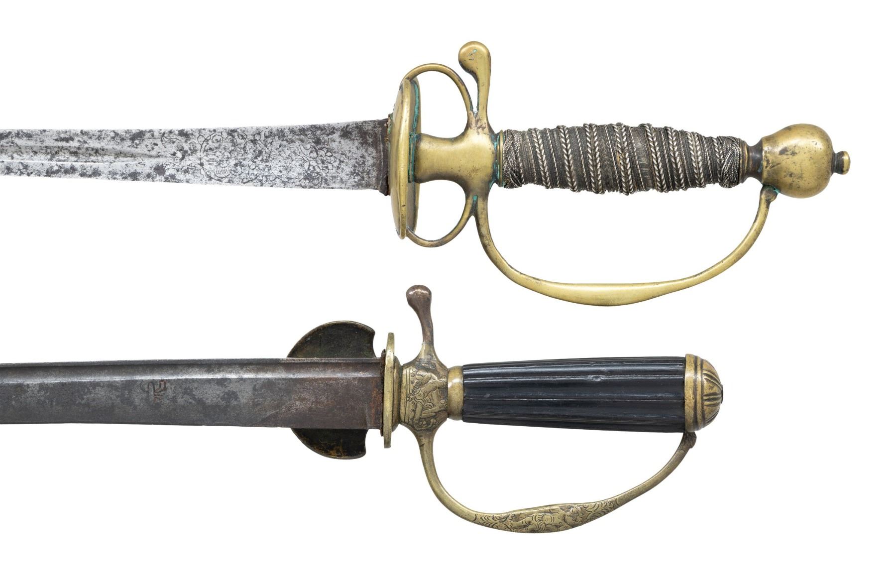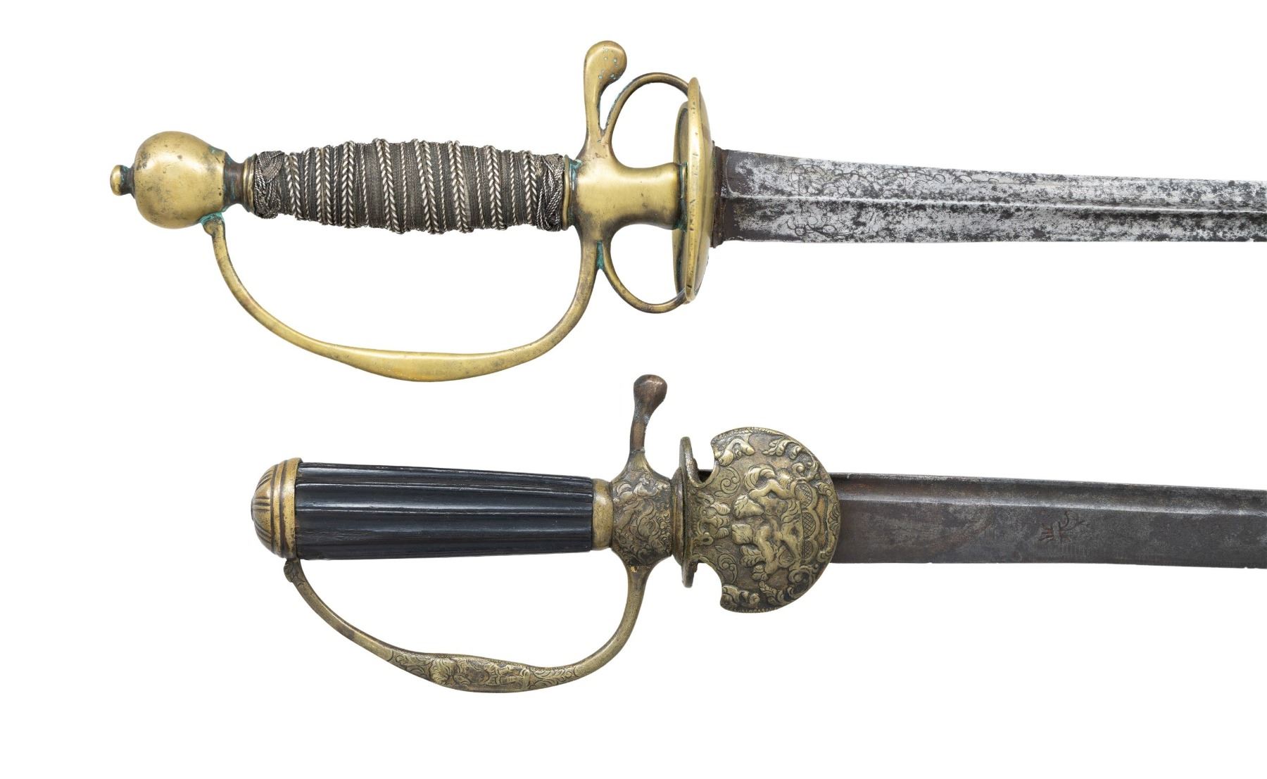 1) A mid-18th century small sword measuring 30" overall with a plain triangular 23 1/4" blade. Brass hilt showing a double kidney guard with high pas d'ane and a globular down turned quillon. Silver wire wrapped grip with silver Turk's head knots at the top and bottom. Plain knuckle bow with a globular pommel. No scabbard. CONDITION: blade has a dark mottled patina and may have been shortened. hilt is good with a mellow patina and a touch of verdigris. Grip wire is complete but slightly dislodged. 2) A good early hunting sword measuring 27 1/4" overall with a 22 1/4" blade with an armorer's stamp on each side. Brass hilt with a down turned clam shell guard with 2 reclining figures. Decorated ferrule and knuckle bow with a globular quillon. Reeded dark horn grip and no scabbard. CONDITION: blade has a dark patina with nicks to the edge. Hilt is a bit worn but has a mellow patina. Grip has minor losses. PROVENANCE: Estate Collection of Nicholas Apergis. (02-24680/BF). $1000-1500.