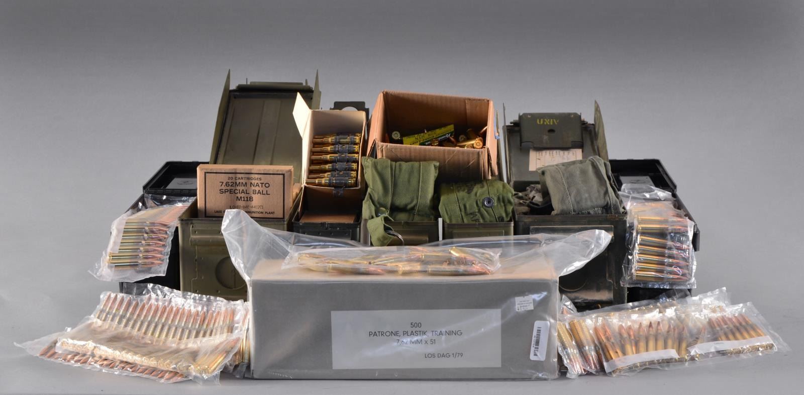 Broken into the following denominations: 680 rds. Prvi Partisan (nny headstamp). / 460 rds. M118 Special Ball. / 1,200 rds. Ball in bandoliers on stripper clips. / 200 rds. military blanks/belted. / 500 Rds. plastic. (02-13775-4/JZ). $700-1,000.