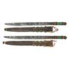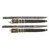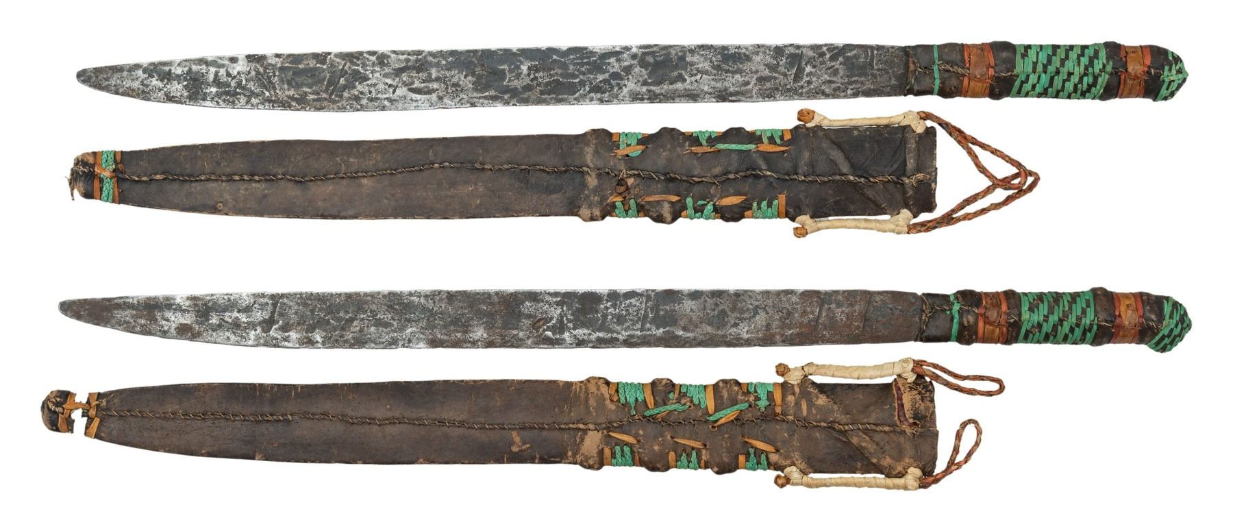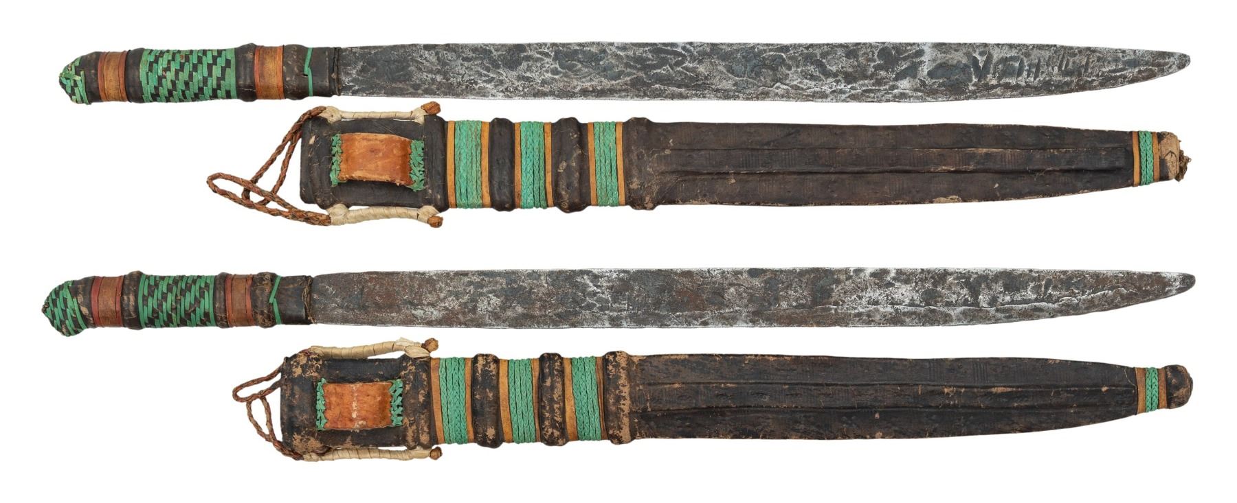 Both appear to be 24.5" overall with leather handle having colored stitches. Blades approx. 18". Leather sheaths with colored stitches & 2 belt loops. CONDITION: blades show dark patina, pitting & oxidation. Leather appears mostly intact with some sm. holes. (02-25756/MD). $300-400.