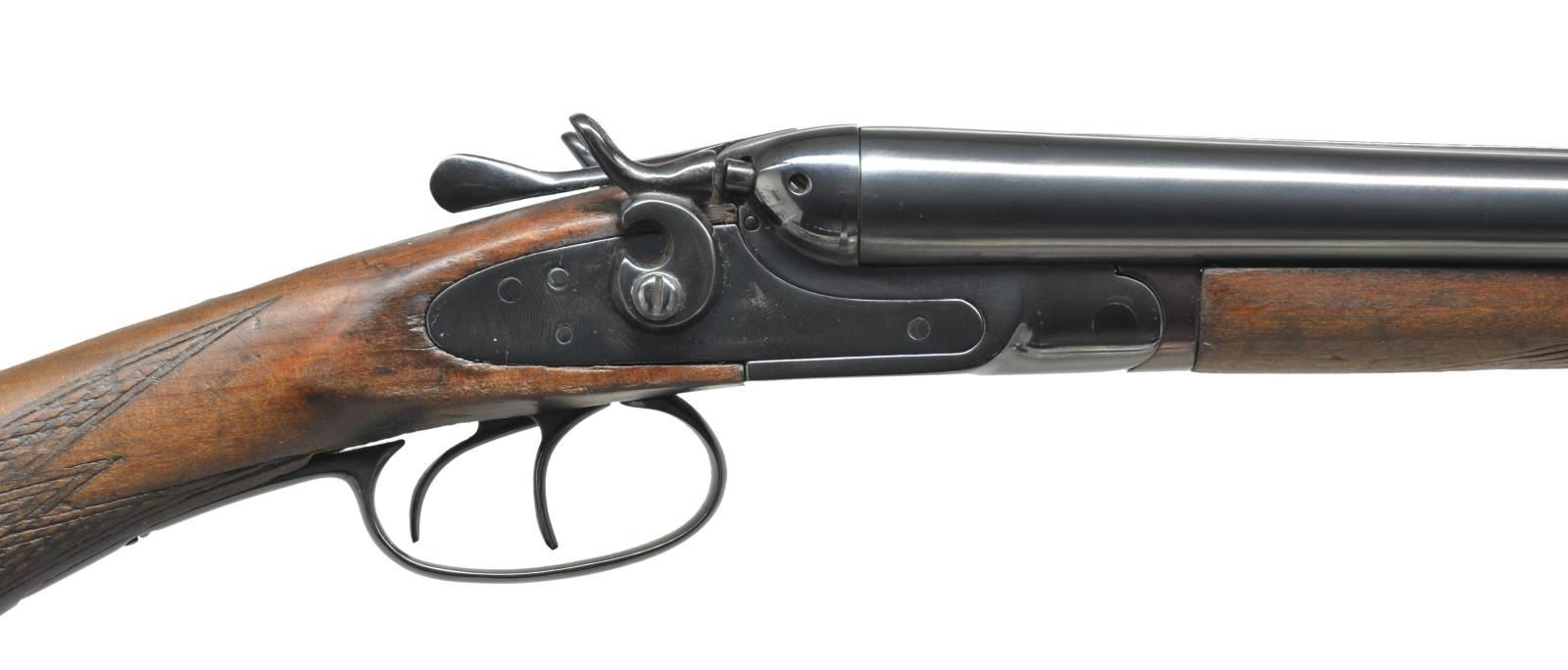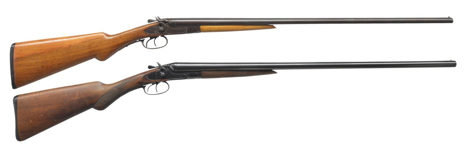 1) Cal. 410, 2 1/2". S# 15188. Bbls. 26" w/ brass bead & fixed Full & Full chokes. Dainty exposed hammer top lever action w/ dbl. triggers & extractors. Reverse firing sequence, front trigger fires left bbl. & rear trigger fires right bbl. Splinter forearm & rnd. knob walnut stock. LOP: 13 1/4" over hard rubber buttplate. WEIGHT: 4 lbs., 10 oz. CONDITION: bbl. blue has faded to an even brown patina. Action has faded to brown. Heavily sanded & refinished stock & forearm showing scratches & marks. Bores show scattered pitting. Forearm is slightly loose on gun. (21-81/DS). 2) Cal. 28 Ga., 2 3/4". S# 6898. Bbls. 26". Light weight exposed hammer top lever action w/ dbl. triggers & extractors. Splinter forearm & hardwood rnd. knob stock have coarse hand checkering. LOP: 13" over replacement buttplate. WEIGHT: 4 lbs., 10 oz. CONDITION: retains 98% brightly polished reblued finish. Original wood finish shows wear w/ dents & handling marks. Forearm has sm. crack at iron. Stock has cracks & chips behind locks. Bbls. are off face & loose on frame. Pitted bores. (21-90/DS). BOTH CURIO. $600-900.
