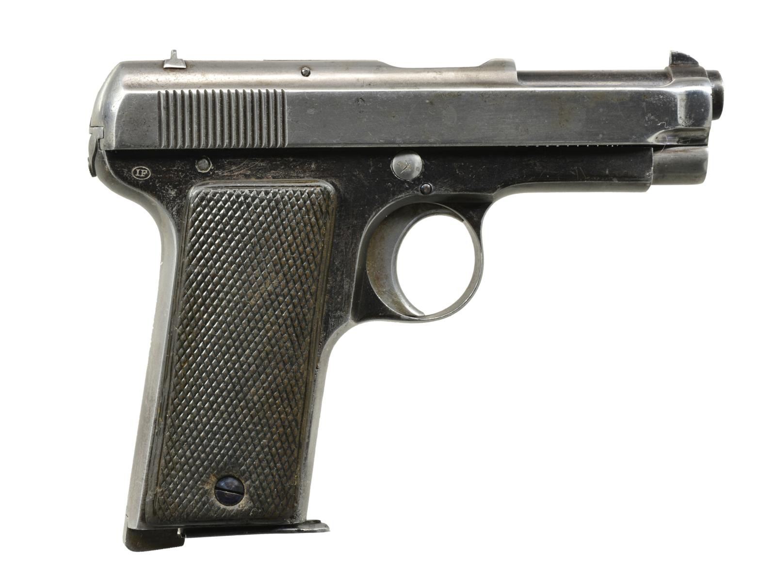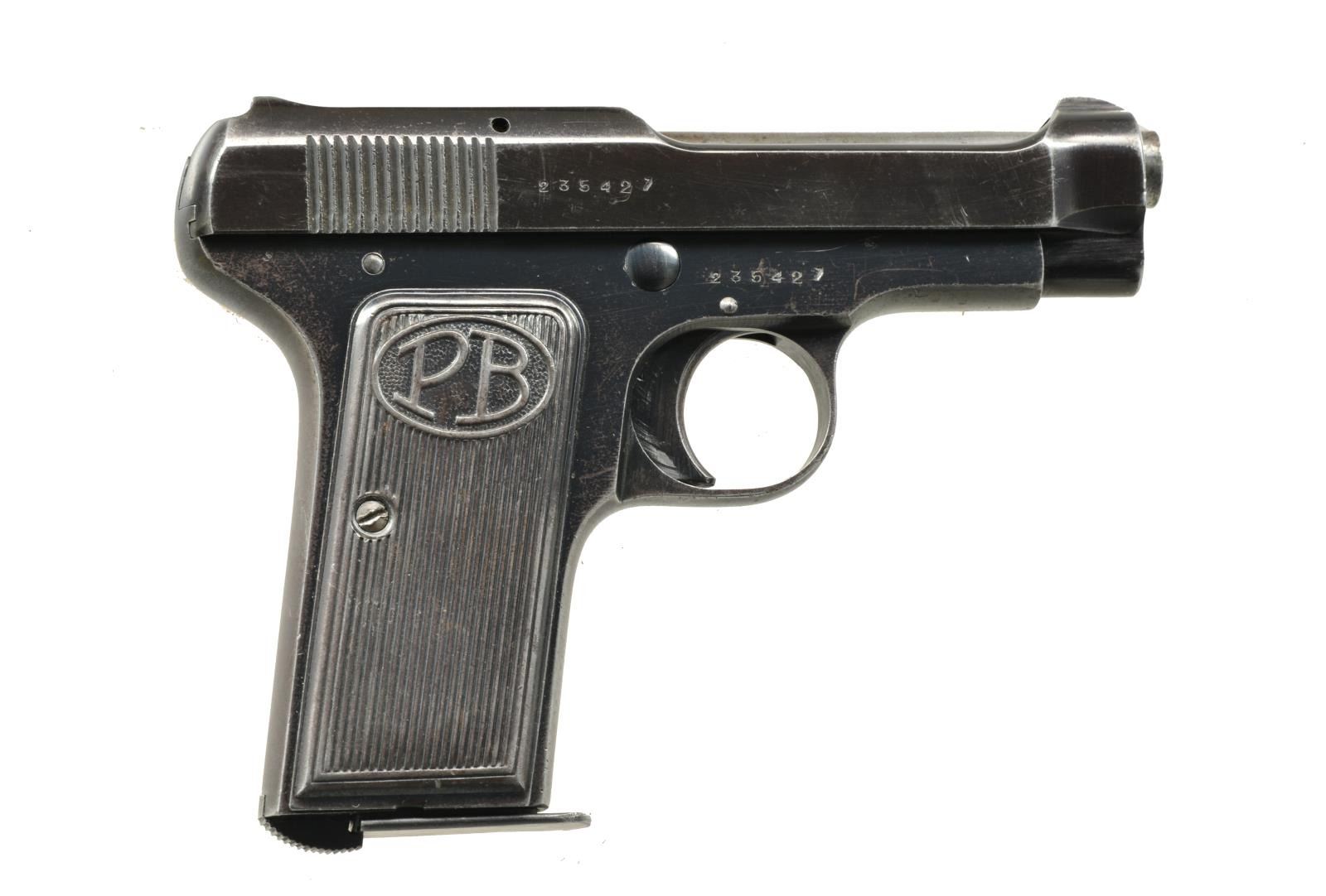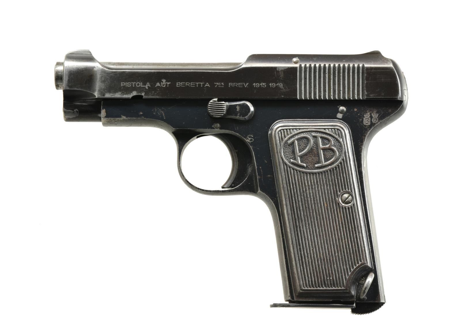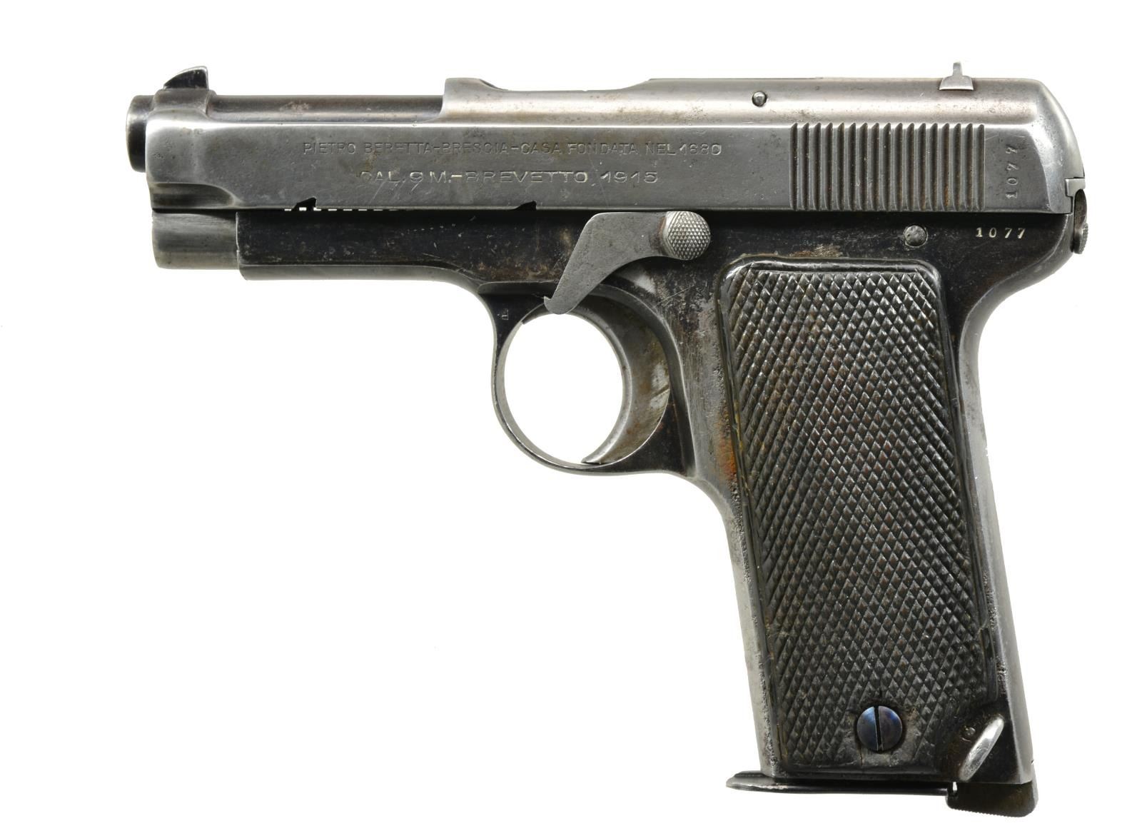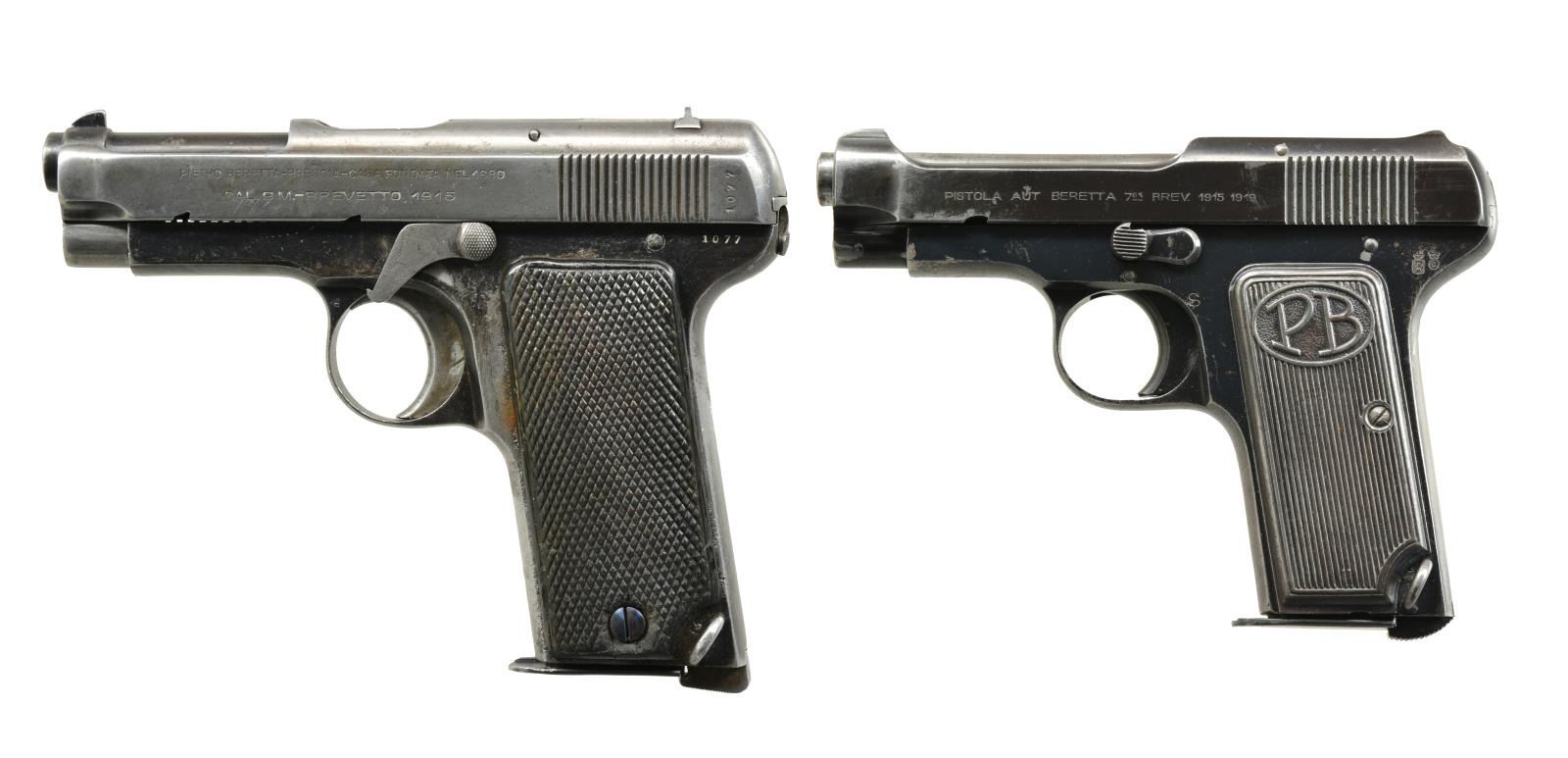 1) MODEL 1915. Cal. 9mm Glisenti. S# 1077. Bbl. 3 3/4". Beretta’s first military pistol of only 16,000 mfg. Low numbered variation w/ matching numbered slide & characteristic exaggerated slide stop. Dark checkered wood grips retained by bottom screw. Right top rear of frame w/ circled “IF”. 9mm Glisenti is the same as 9mm Luger dimensionally, but has less power; 9mm Luger should under no circumstances be used in this pistol. MAGS: 1 good reproduction 8 rd. CONDITION: very good appearing grips retained by new replacement screws. Slide void of finish & cleaned of prior oxidation, leaving light pits but clear markings. Frame has light prior pitting on front strap & noticeable wear in grip area along w/ appearance of polishing plus refinish. Fair bore w/ light wear to rifling & even light to moderate pitting. (20-1456/NW). 2) MODEL 1922. Cal. 7.65mm (32 ACP). S# 235427. Bbl. 3 3/8". Successor of model 1915-1917 mfg. 1922-1932 in S# range 200,000-243,000 w/ more open matching numbered slide & modern slide stop. 2 Proofs at upper left rear of frame. Stamped metal “PB” logo grooved metal grips each retained by single screw. MAGS: 1 very good replacement 8 rd. CONDITION: good overall appearance w/ high point & function wear plus some areas of pinprick oxidation along w/ patina in grip area. Good plus bore w/ slight ring at front third of bbl. Extremely stiff recoil spring. (20-1458/NW). BOTH CURIO. $700-1,000.