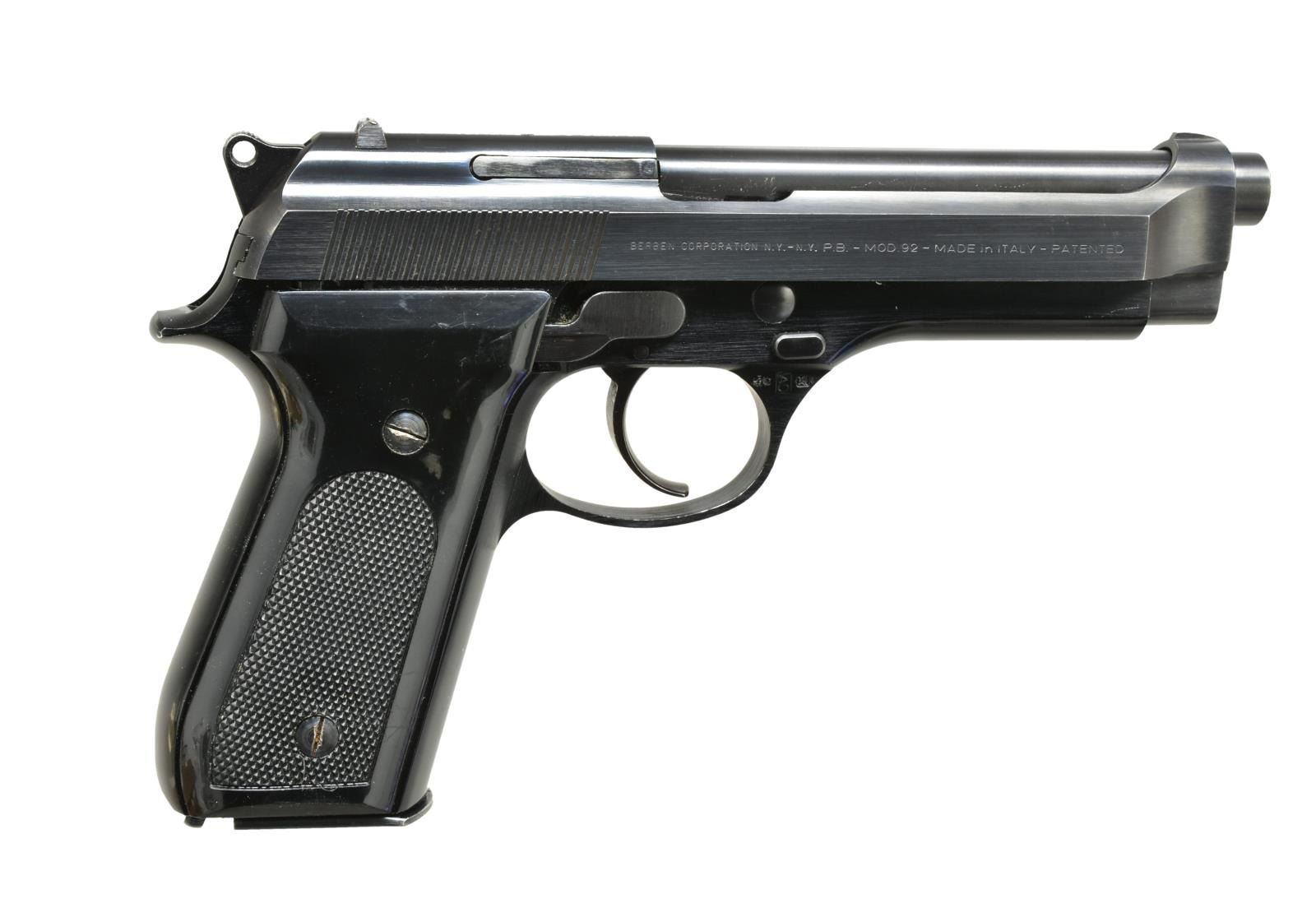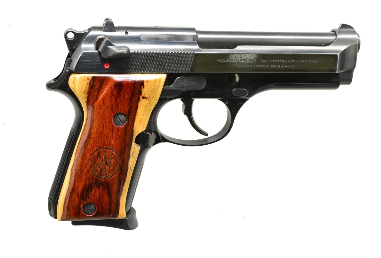 1) Cal. 9mm Luger. S# B12071Z. Bbl. 5”. Early Beretta model 92 w/ safety located bottom of backstrap instead of the familiar thumb location. These early guns had no decocker which became synonymous w/ later traditional DA models. Serrated slide w/ left side controls. Fixed integral blade front sight. Drift adj. rear notch. Blued finish w/ black plastic grips. MAGS: 2 - 15 rd. mags. CONDITION: original finish on exposed metal surfaces mostly complete w/ thinning on high spots & areas of mechanical interface. Shiny bore w/ good rifling. (20-3932/JZ). 2) SB COMPACT. Cal. 9mm Luger. S# C06373Z. Bbl. 4 1/4”. Desirable compact Beretta SB model w/ 2 tone laminated grips & factory blue finish. Ambidextrous safety decocker w/ enlarged slide release. This model has mag. release behind trigger guard in the traditional American position. Serrated slide. 2 Dot drift adj. sighting system. MAGS: 1 - 13 rd. mag. UNATTACHED ACCESSORIES: factory slimline checkered wood grips. CONDITION: original exterior finish is complete & uniform w/ light thinning on high marks & areas of mechanical interface. Custom grips have what appear to be natural depressions w/ clear visible logo on each side. Mechanism functions smooth. Shiny bore w/ good rifling. (20-3937/JZ). BOTH MODERN. $700-1,100.