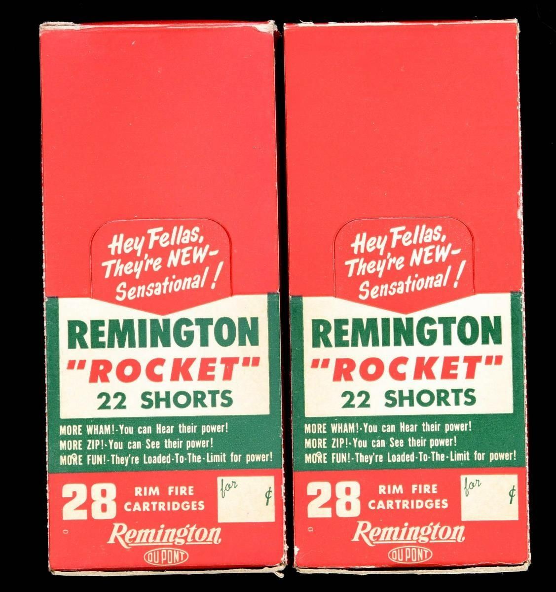 SEALED CHICKLET PACKS. 560 round bricks, 1120 rounds total. Remington Arms Company started marketing their revolutionary new “Rocket” ammunition in the mid 1950s. They are .22 Short loads with sintered iron projectiles, boasting a whopping muzzle velocity at over 1600 feet per second. They are in bricks containing 560 rounds, in 20 sealed “Chicklet Packs”, each containing 28 individual cartridges. The bricks are red, white & green cardboard packages, each acting as a counter display when properly folded. It is marked “Dispenser No. 54 / Contains 560 Rim Fire / No. 1222 Cartridges”. The top of each brick is marked as follows; “Hey Fellas, They’re NEW – Sensational! Remington “Rocket” 22 Shorts. MORE WHAM! – You can Hear their Power! MORE ZIP! – You can See their power!, MORE FUN! – They’re Loaded-To-The-Limit for power! 28 Rim Fire Cartridges. Remington. DuPont”. Each brick is in a brown cardboard sleeve. Individual Chicklet packs are sealed in clear cellophane w/ a red pull tie to open them. Dupont packaging indicates this ammo is “Non-Corrosive” & “Made in the USA”. CONDITION: all chicklet packages are unopened, still in factory sealed cellophane. Colored brick packs don’t appear to have been folded into their display configuration and are unmarked in the ”price” areas for dealers to have marked their retail pricing. Colors are still bright, appearing to have been stored in the original brown cardboard sleeves. Cardboard sleeves have some light staining but no damage. (02-21320/JZ). $600-1000.