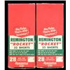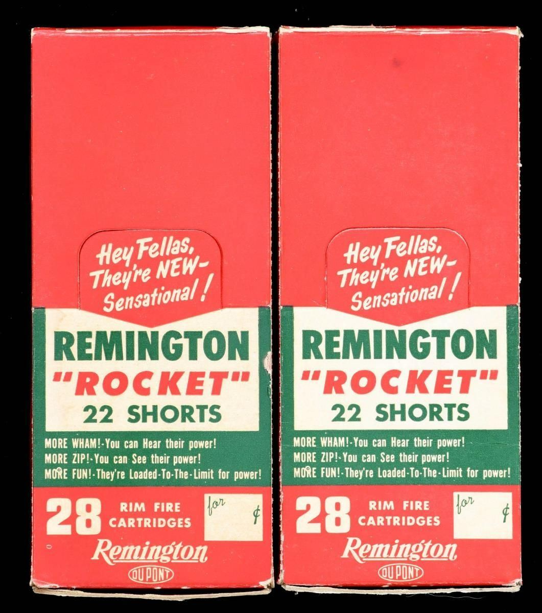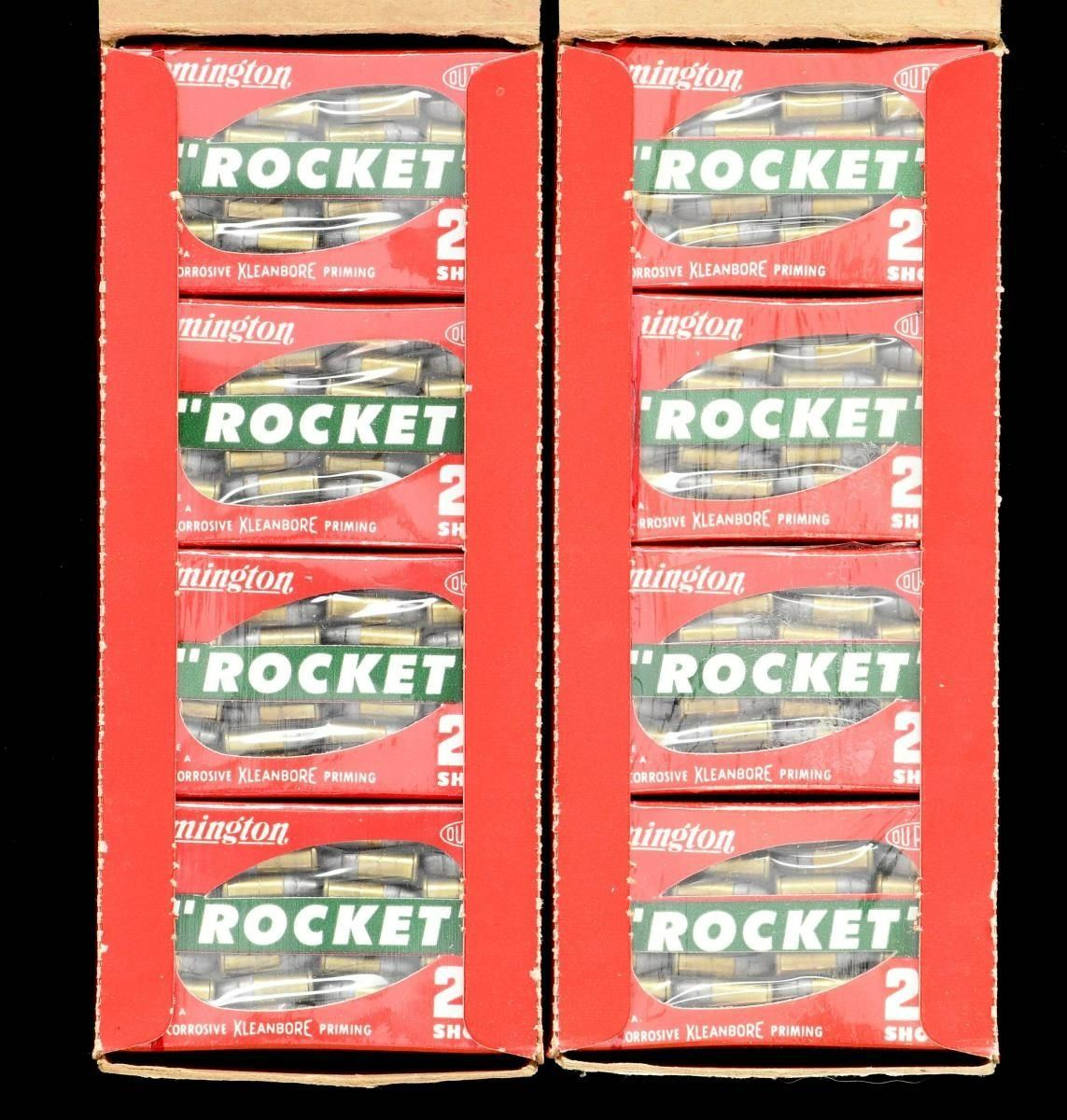 SEALED CHICKLET PACKS. 560 round bricks, 1120 rounds total. Remington Arms Company started marketing their revolutionary new “Rocket” ammunition in the mid 1950s. They are .22 Short loads with sintered iron projectiles, boasting a whopping muzzle velocity at over 1600 feet per second. They are in bricks containing 560 rounds, in 20 sealed “Chicklet Packs”, each containing 28 individual cartridges. The bricks are red, white & green cardboard packages, each acting as a counter display when properly folded. It is marked “Dispenser No. 54 / Contains 560 Rim Fire / No. 1222 Cartridges”. The top of each brick is marked as follows; “Hey Fellas, They’re NEW – Sensational! Remington “Rocket” 22 Shorts. MORE WHAM! – You can Hear their Power! MORE ZIP! – You can See their power!, MORE FUN! – They’re Loaded-To-The-Limit for power! 28 Rim Fire Cartridges. Remington. DuPont”. Each brick is in a brown cardboard sleeve. Individual Chicklet packs are sealed in clear cellophane w/ a red pull tie to open them. Dupont packaging indicates this ammo is “Non-Corrosive” & “Made in the USA”. CONDITION: all chicklet packages are unopened, still in factory sealed cellophane. Colored brick packs don’t appear to have been folded into their display configuration and are unmarked in the ”price” areas for dealers to have marked their retail pricing. Colors are still bright, appearing to have been stored in the original brown cardboard sleeves. Cardboard sleeves have some light staining but no damage. (02-21321/JZ). $600-1000.