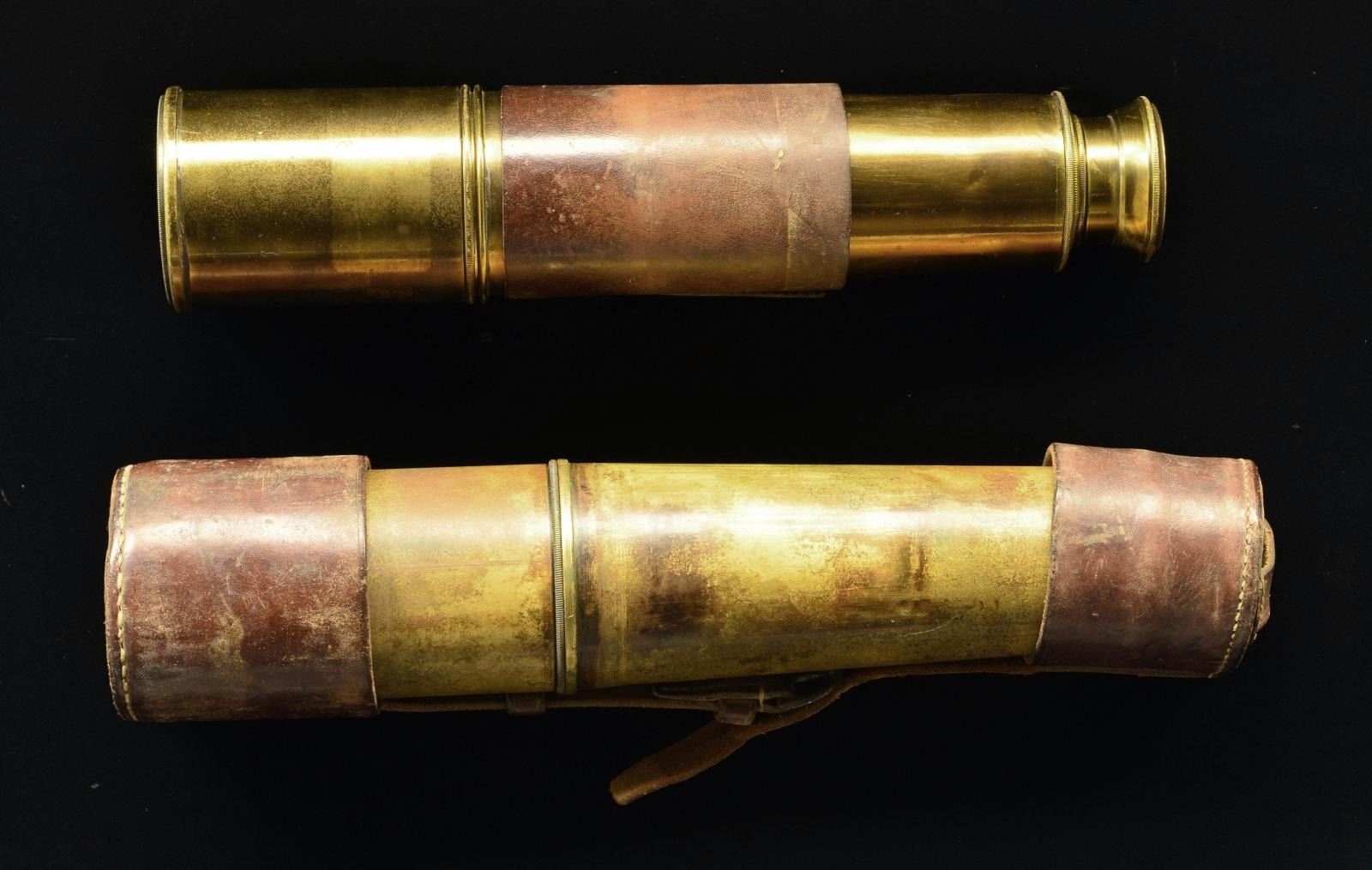 2) 4 Draw telescope marked on 4th draw w/ "TEL. SIG. MK.VI." "BC LTD. & CO" (in logo) plus "7713", "O.S.717.G.A.". Brass telescope has 2" objective lens. Ocular lens has sliding shutter. Leather covering has been removed. UNATTACHED ACCESSORIES: leather scope caps, unmarked. Leather sleeve originally installed on sunshade is present. CONDITION: brass parts turning overall patina w/ notable staining on body & sunshade. Fine scratches, scattered sm. dents throughout. Eyepiece retains lg. percentage of black finish. Leather scope caps have wear, staining, scuffing & sm. areas of loose stitching. (02-16811-1/RW). $400-600.
