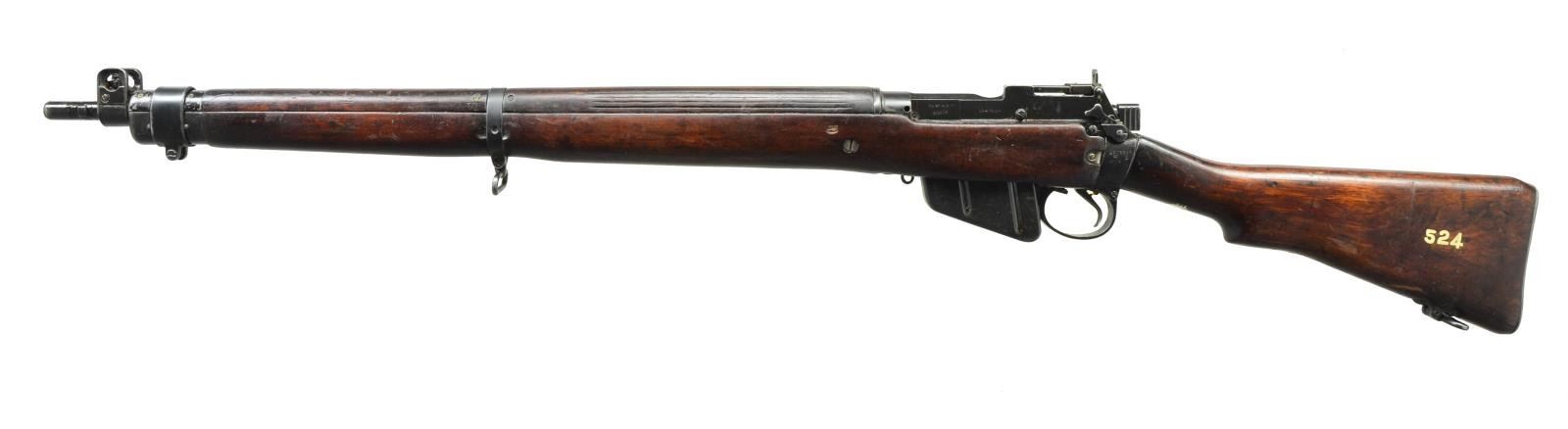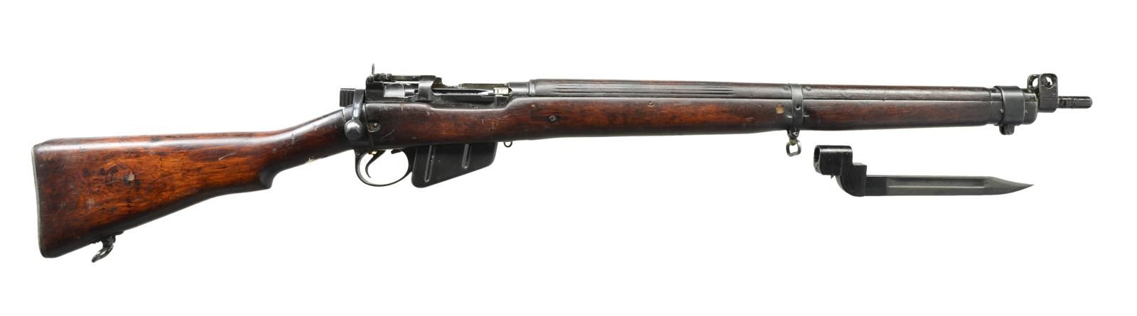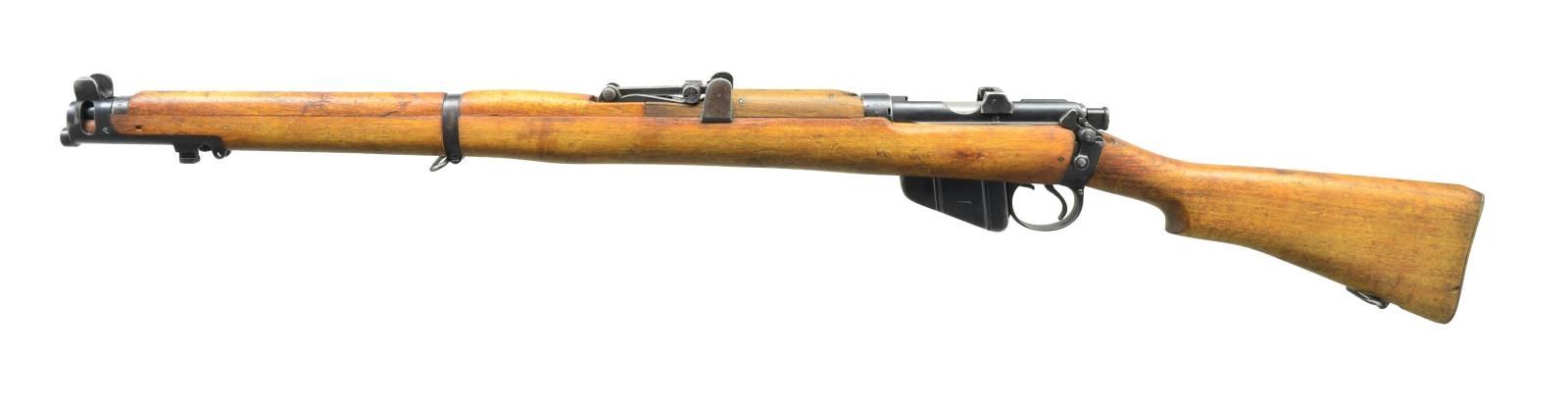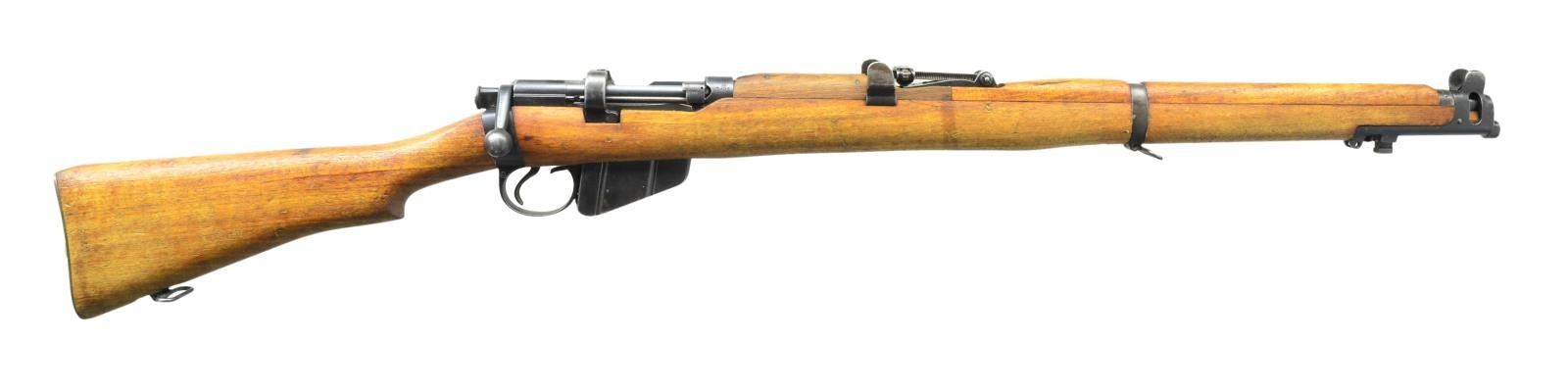 1) AUSTRALIAN LITHGOW #3 RIFLE. Cal. 303 Brit. S# A97891. S# match on receiver & bolt. Bbl. 25". Receiver is marked on right side of butt socket w/ A inside star & LITHGOW SHTLE III star. Dated 1922. Tangent rear sight graduated to 2,000 yards. Blade front sight w/ protective ears. Nosecap has bayonet lug. Stacking swivel is not present. Hardwood stock set w/ brass trap buttplate. CONDITION: stock set has arsenal rework type finish rendering markings obscure, light wear staining & handling marks. Metal has 70% original finish w/ light wear & handling marks. Very good shiny bore. (21-2495/RW).