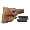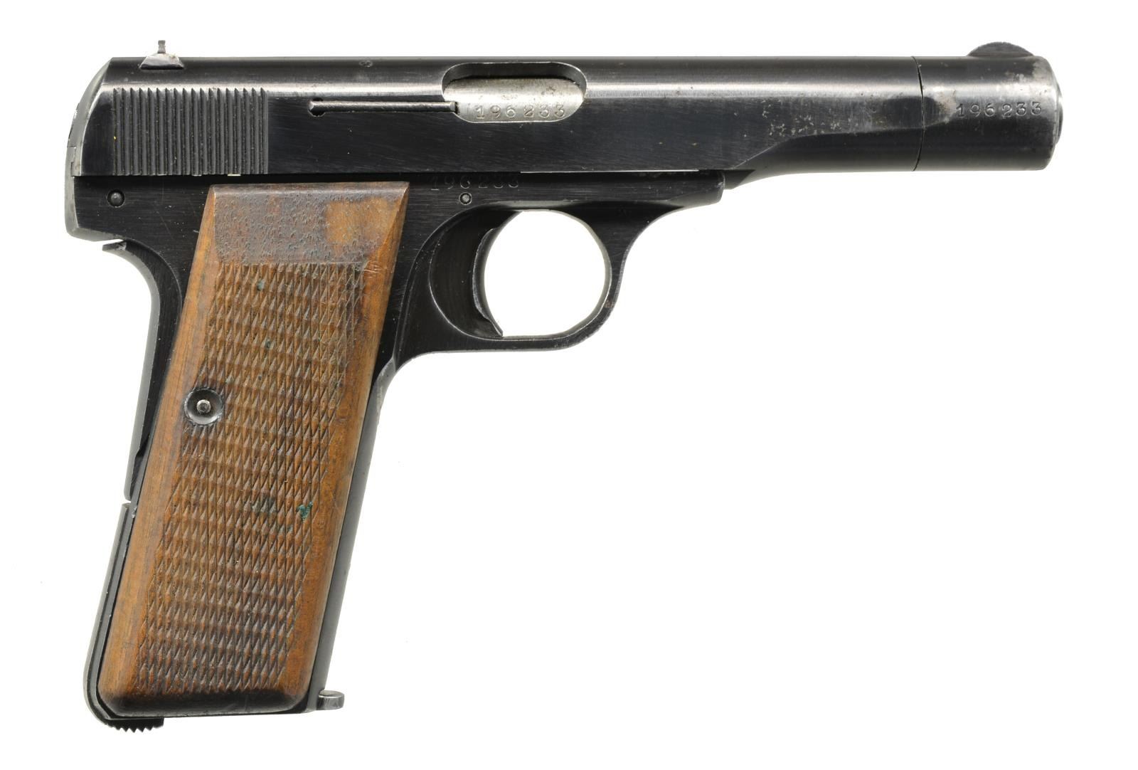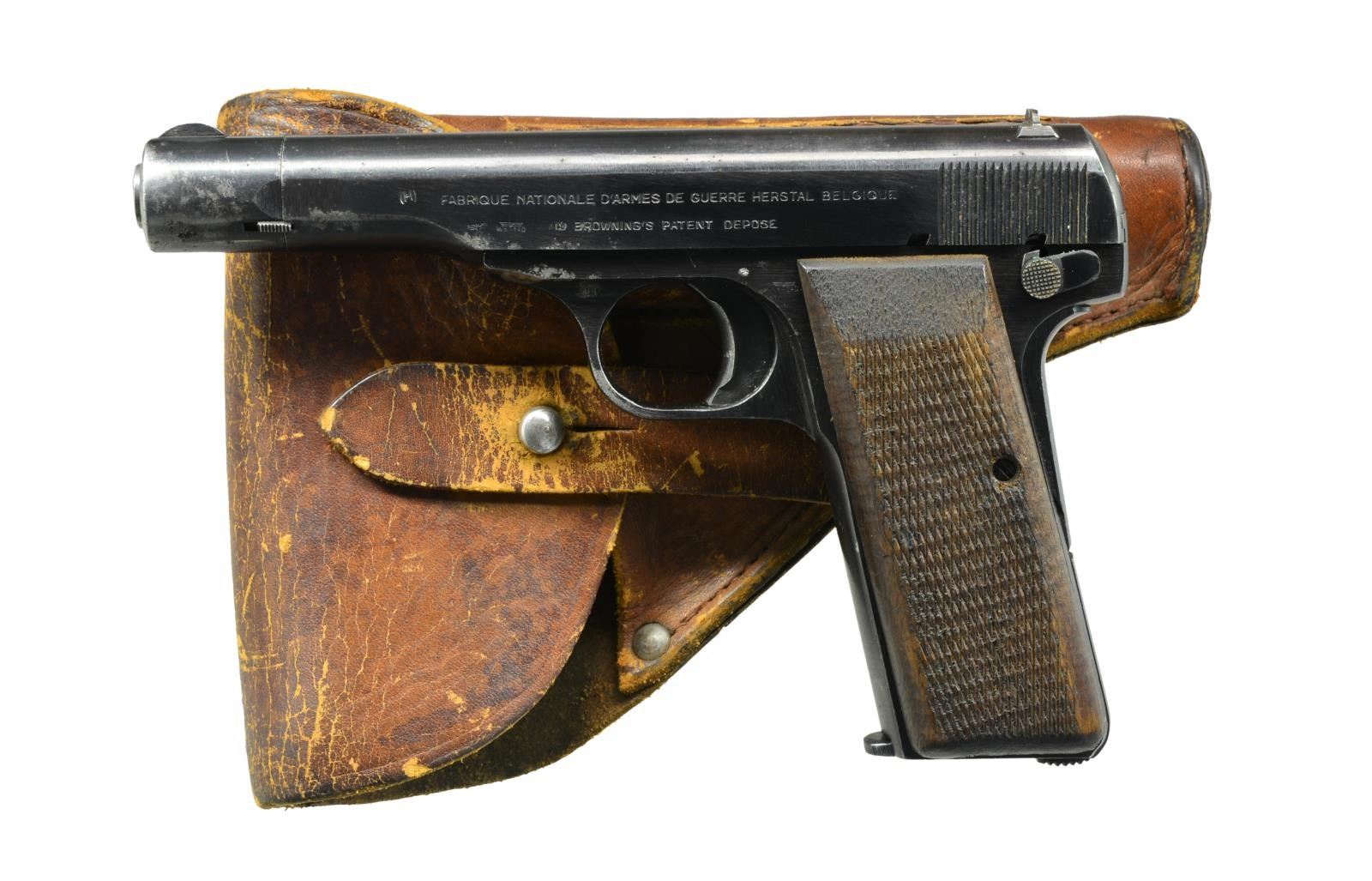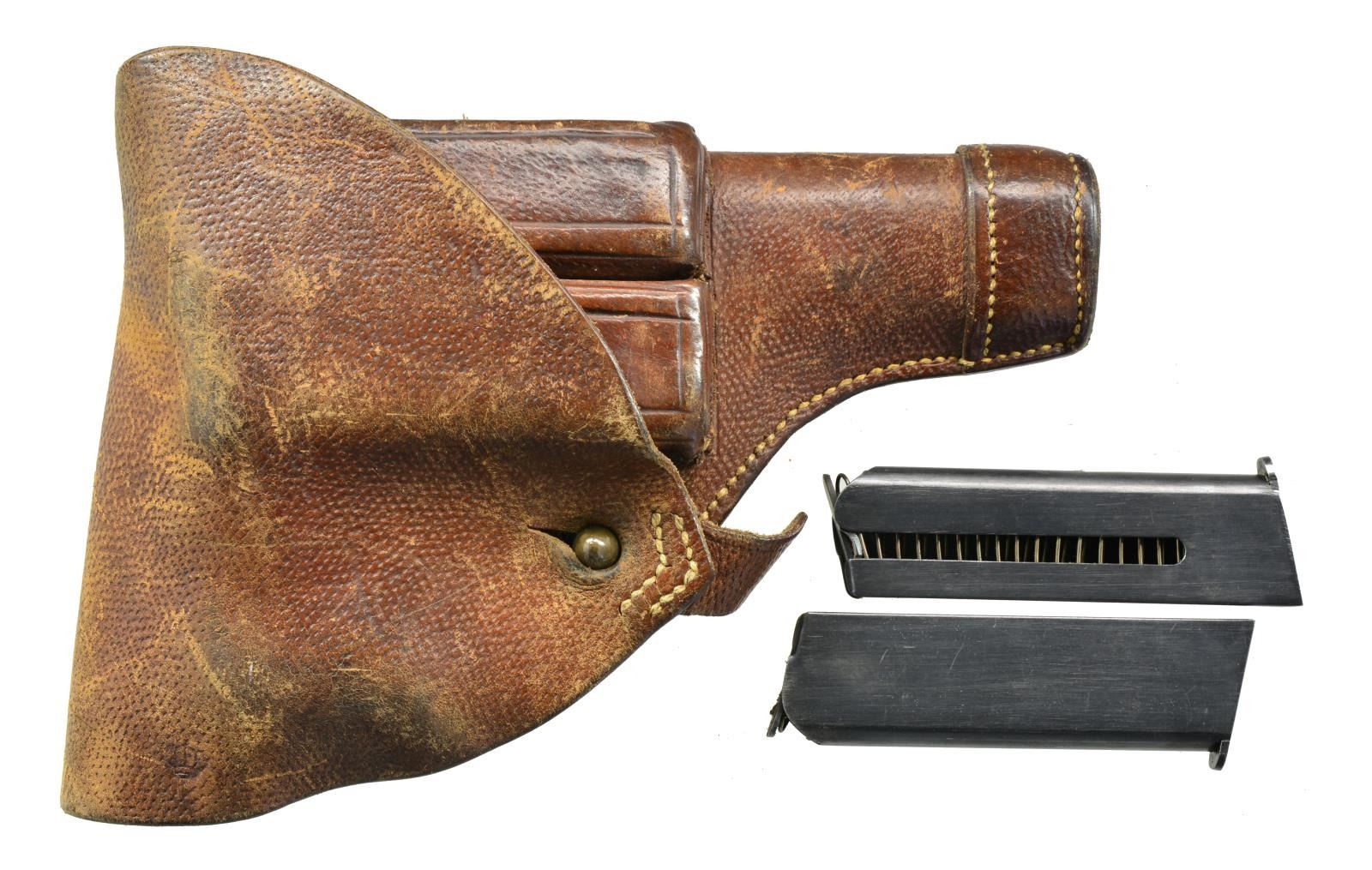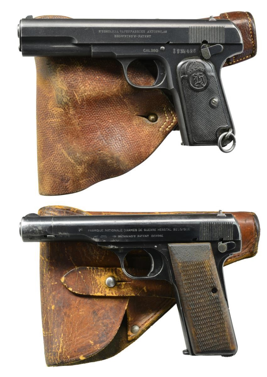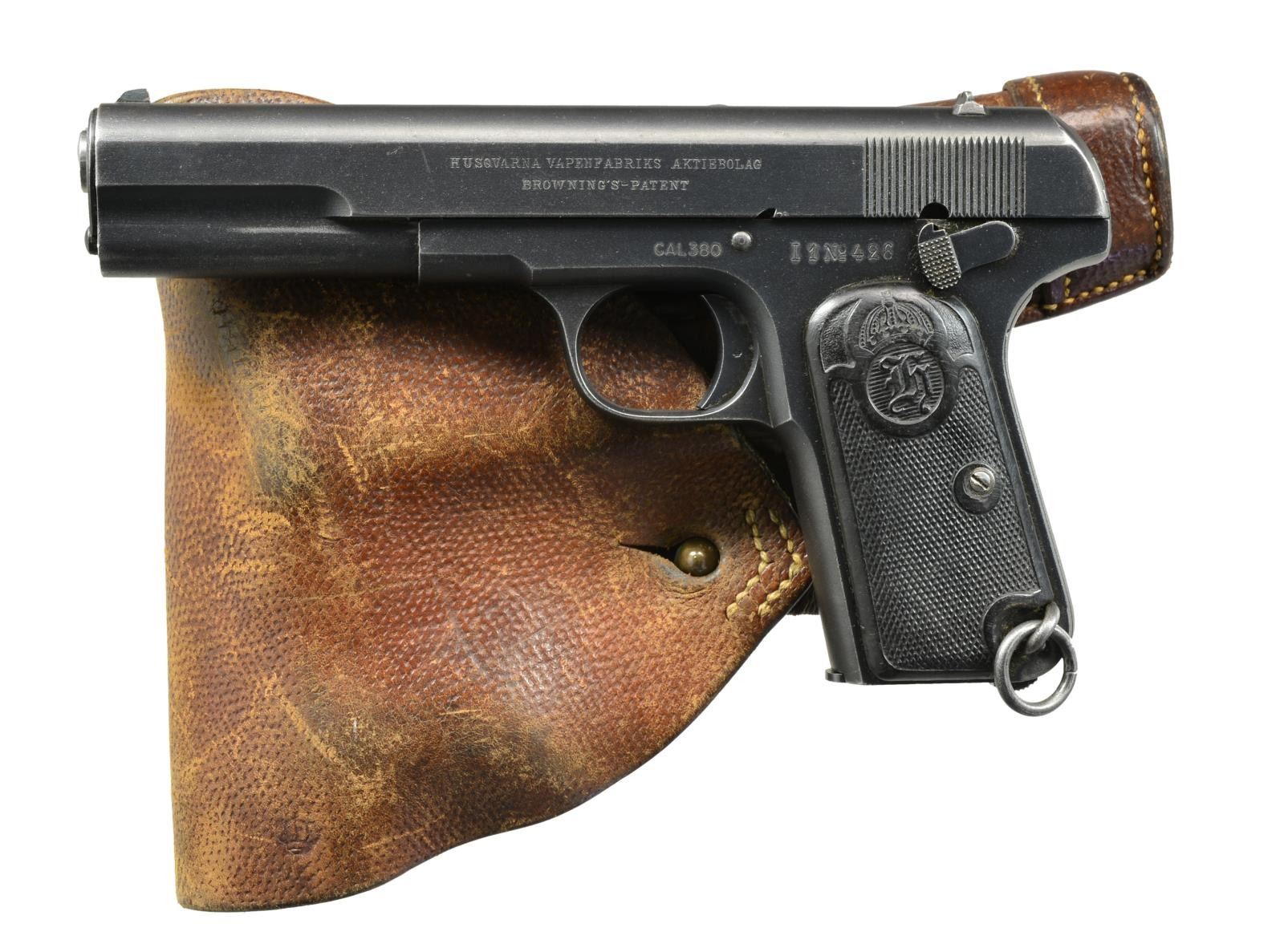 & 1922 FN. 1) HUSQVARNA MODEL 1907. Cal. 380 ACP. S# 4026. Bbl. 5", converted from 9mm Browning long to 380 ACP for U.S. sales. Swedish military pistol mfg. 1917-1942. Matching numbered slide, bbl. & logo checkered hard rubber grips. Rear of frame w/ crown, "TT" & "HK". Left side of frame above grip marked "I1No426" & above trigger "CAL380". Browning design identical to FN Model 1903. Bottom mag. latch & lanyard ring at bottom left rear of butt. Crown proofed sm. parts. MAGS: 3 very good 7 rd. UNATTACHED ACCESSORIES: good pebble grained Swedish military holster inked "304". under flap & stamped "1915 No 51". Flap latches over brass stud, reinforced muzzle cap, dbl. belt loops & 2 mag. pouches. CONDITION: very good as arsenal refinished having light high point & function wear mostly on slide. Good to very good grips w/ light hand wear; near excellent bore. (20-2138/NW). 2) FN MODEL 1922. Cal. 7.65mm (32 ACP). S# 196233. Bbl. 4 1/2". Mfg. 1940-1944 during German occupation having "WaA140" proofs along w/ eagle party symbol proofs. Matching numbered bbl., slide & nose cap. Checkered walnut grips. Originally designed for Yugoslavian military as Model 1910 w/ longer bbl. Thumb, grip & mag. safeties. MAGS: 2 good FN marked 9 rd. UNATTACHED ACCESSORIES: plain brown flap holster w/ stud & strap retention plus spare mag. pouch; single wide belt loop. Fair to good appearance w/ scuffs & wear including through wear at corner of mag. pouch. CONDITION: good general appearance w/ cleaned light oxidation near muzzle & rear of grip frame. Holster style finish loss. Very good dark hand worn grips; near excellent bore. (20-2142/NW). BOTH CURIO. $800-1,200.