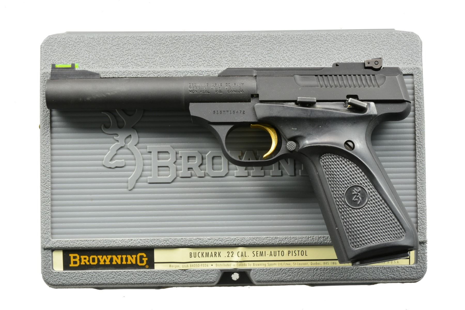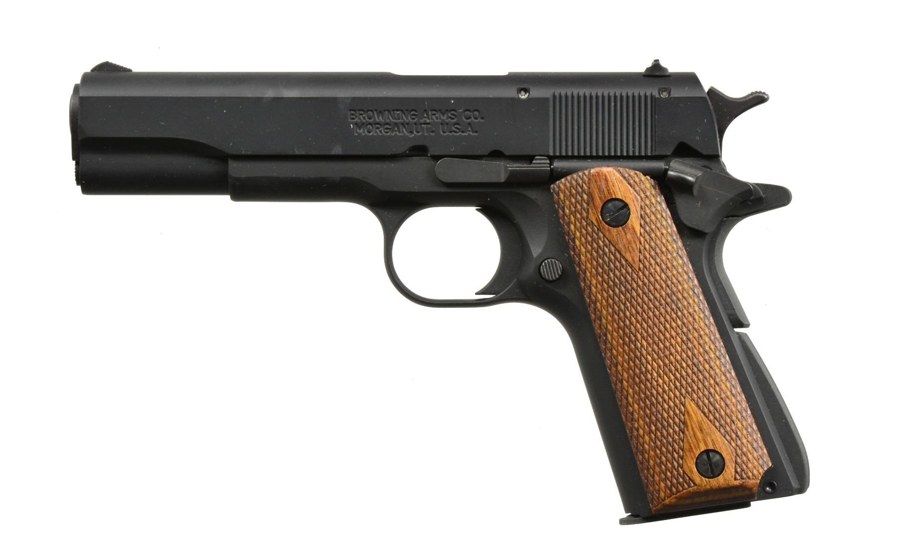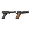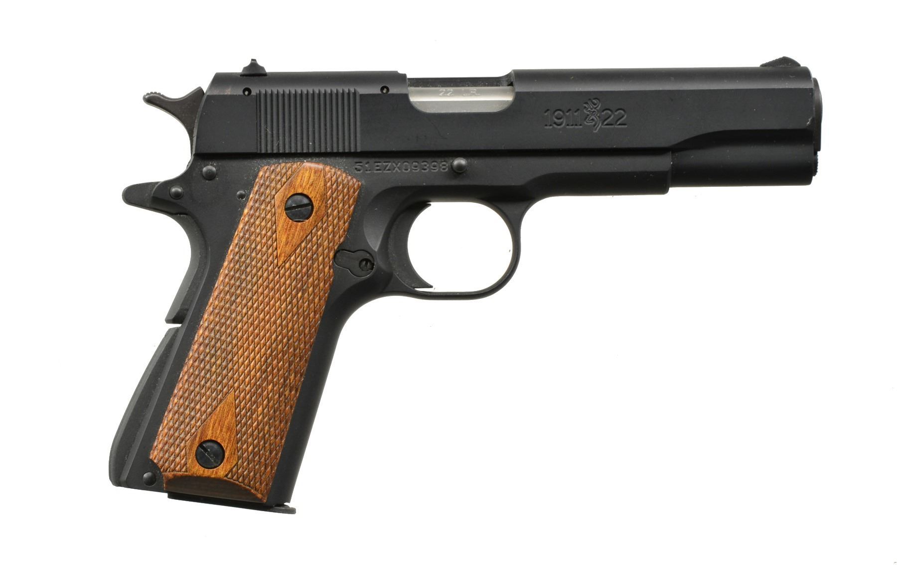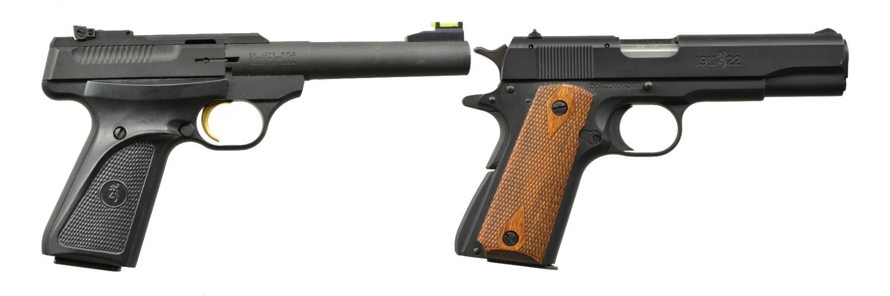 BOTH: cal. 22 LR. MAGS: 2 factory 10 rd.; appropriate 1 for each. CONDITION: all aspects near excellent including bore. 1) BUCK MARK CAMPER MODEL. S# 515MW15472. Bbl. 5 1/2" bull w/ replacement green fiber optic front sight plus adj. rear; both bbls. mounted. Mfg. 2004 (1999-2012) having matte black finish w/ Browning logo checkered black plastic grips. UNATTACHED ACCESSORIES: factory gray plastic case w/ packaging to include original blued sight. (20-1233/NW). 2) MODEL 1911-22. Cal. 22 LR. S# 51EZX09398. Bbl. 4 3/8"; fixed sights on slide w/ drift adj. rear. Mfg. 2013 (2011-date) w/ alloy construction, stainless match crowned bbl., matte black finish & dbl. diamond checkered hardwood grips; 7/8 scale sized Model 19911-A1 w/ its standard operating features. (20-1253/NW). BOTH MODERN. $500-750.