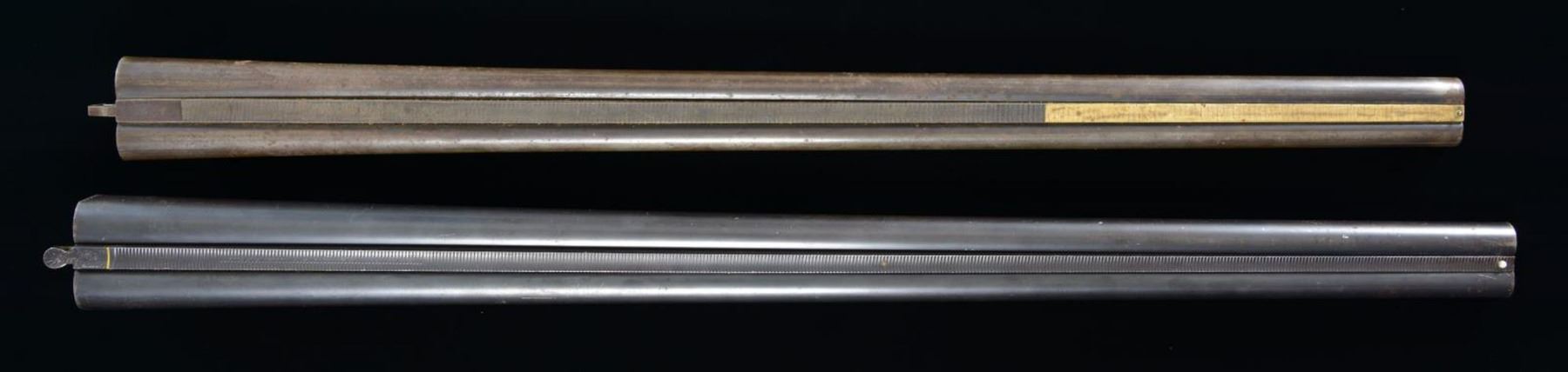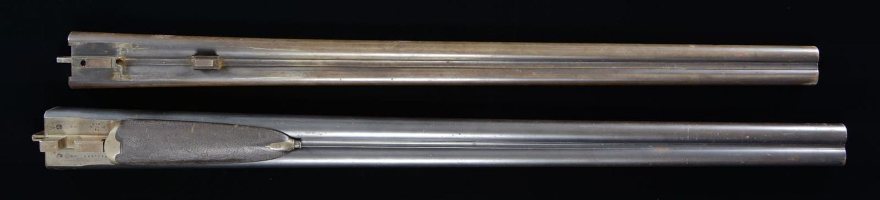 1) BELGIAN FRANCOTTE. S# 22741. The 32" bbls. marked for 2 7/8" chambers. Matted, concave, slightly raised rib has white front bead, remnants of mid bead, is engraved "VON LENGERKE & DETMOLD US AGENTS NEW YORK", and has crossbolt extension. CONDITION: bbls have good blue mixing w/ brown patina showing scattered areas of oxidation, white paint, & wear. Good, shiny bores w/ light fouling. 2) SYRACUSE ARMS. S# 8349. The 30" bbls. have grooved, slightly raised rib w/ brass front bead. Forearm has gouges in checkering w/ very good wood finish on interior. Iron case colors are very good w/ area of oxidation. CONDITION: bbls. have fair bluing mixed w/ brown patina, oxidation, & wear. Bores show pitting & scratches. Portion of rib has tan tape. (02-19944/MD). $100-400.