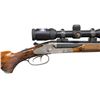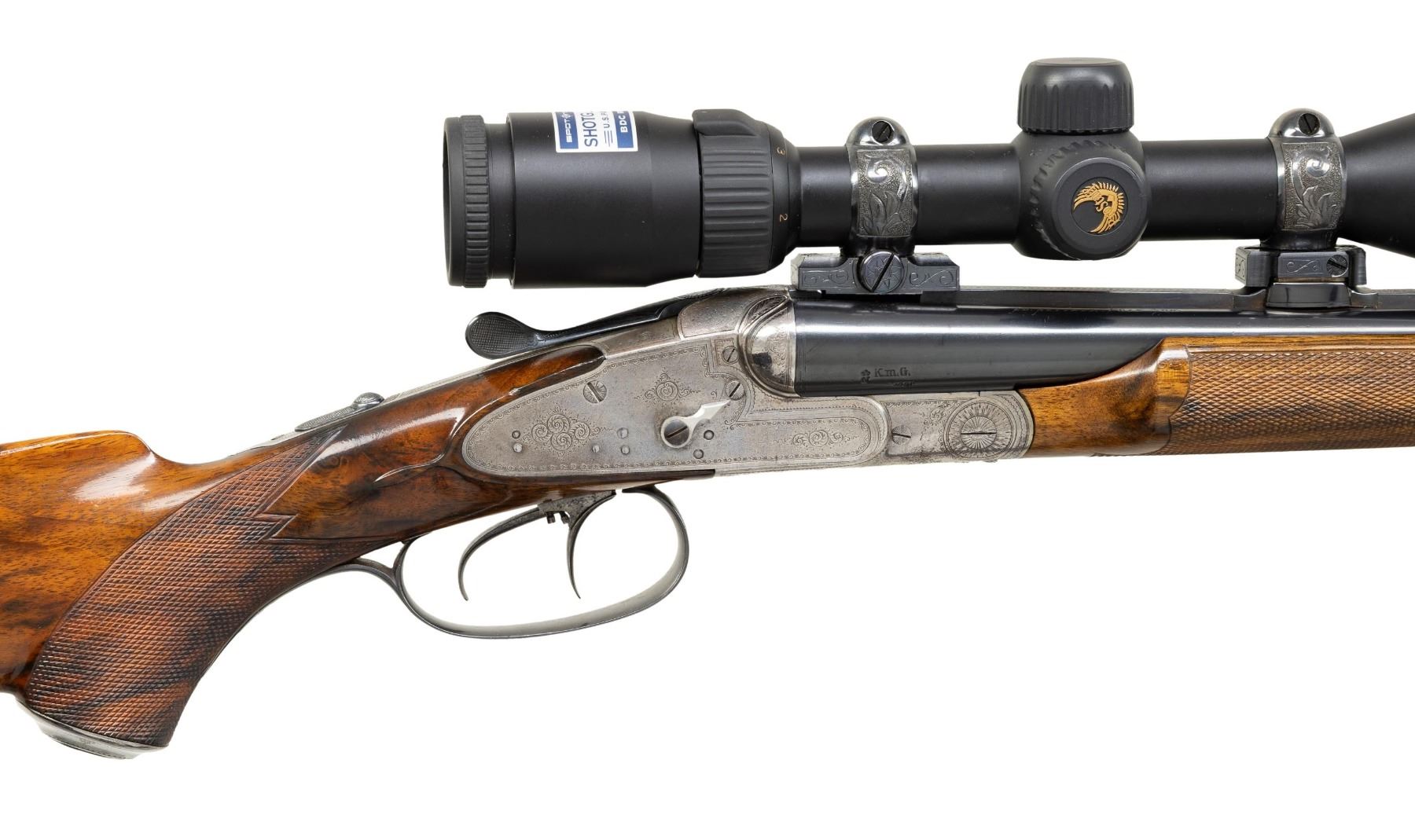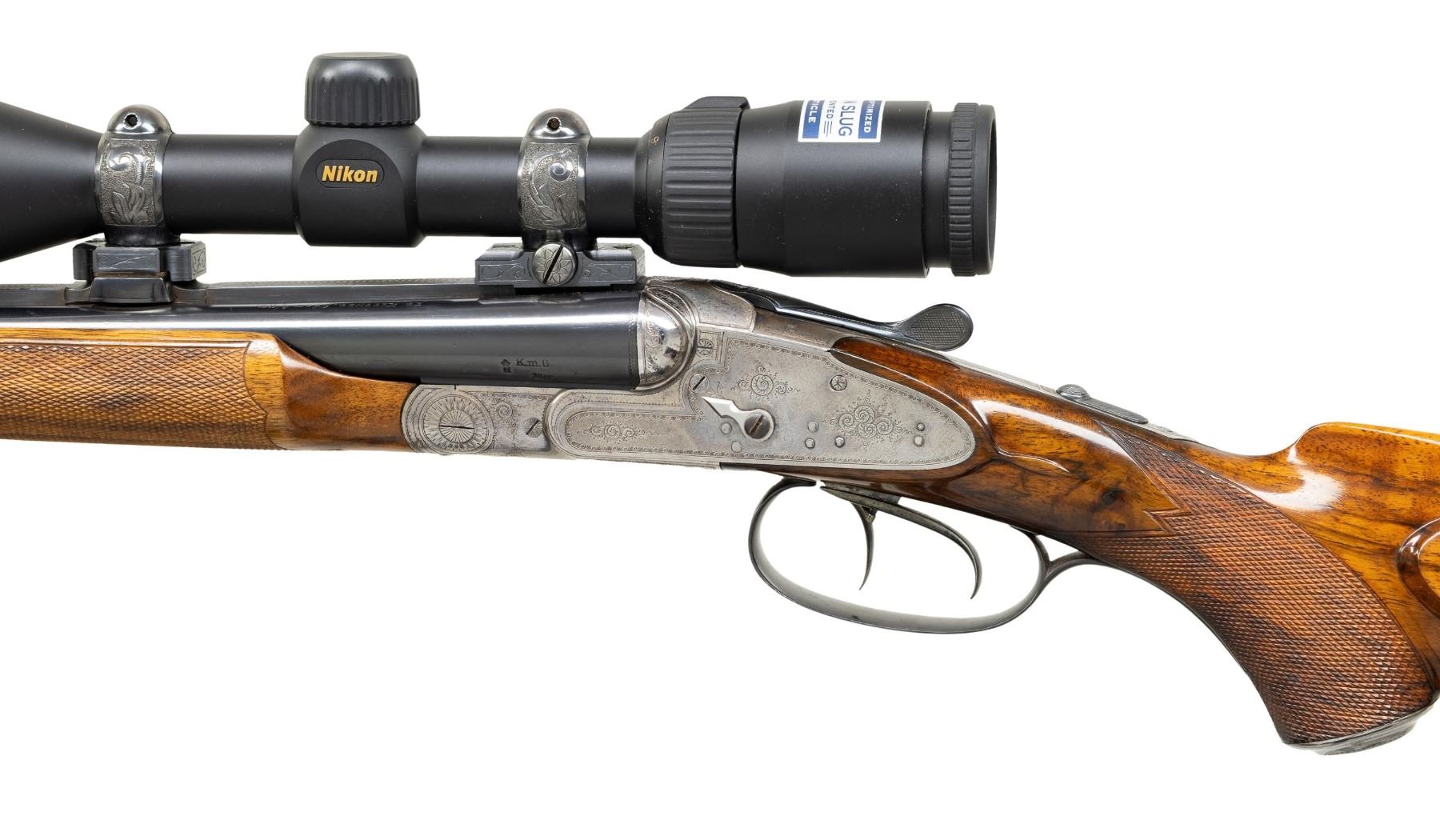 KETTNER WITH SCOPE. Cal. 11.2 X 60 (?) (43 Mauser ?)/22 Hornet. S# 62687. Probably actually made by J.P. Sauer the 25-1/8" barrels fitted with full length matted rib holding one standing, one folding leaf rear and gold bead front sights have retailer's name and address on tops. Barrels are fitted with Buehler scope bases. Bottoms of barrels are stamped with German nitro proofs and Sauer # 62687 along with Kettner # 1341 that also appears on watertable and trigger guard tang. Left barrel has been tubed to 22 Hornet with barrel flat marked "5.4/35". Coin finished sidelock action with clock hand cocking indicators also features non-automatic safety and double triggers (both set). Action is engraved with sprays of well cut scroll surrounded by line and scroll borders. Fences are nicely filed. Trigger guard engraved with scroll on bow has Kettner number on tang. Very nicely marbled and lightly figured European walnut steel capped pistol grip buttstock measures 14" over ribbed horn buttplate and features small shadow line right hand cheekpiece, elongated drop points and point pattern checkering on grip. A cartridge trap on toeline has space for four rounds. Newly made beavertail forend wood has fleur-de-lis checkering and deeply recessed original Deeley release. Rifle is fitted with Nikon Pro Staff 2-7X scope in engraved Buehler rings. CONDITION: fine as refurbished. Barrels retaining nearly all of a good re-black. Action cleaned to coin finish. Clock hands appear to be replaced. Buttstock retains nearly all of a glossy oil finish over marks that are both light and deep. Checkering is re-cut. Forend wood retains nearly all of its original finish. Hornet bore is very fine. Original 43 bore in right barrel is dark with strong rifling. Action is slightly loose; fairly tight with forend installed. Triggers will set. Scope is very fine close to "as new". PROVENANCE: From the Buckstix Collection. (25-6439/MGM). CURIO. $2,000-3,000.